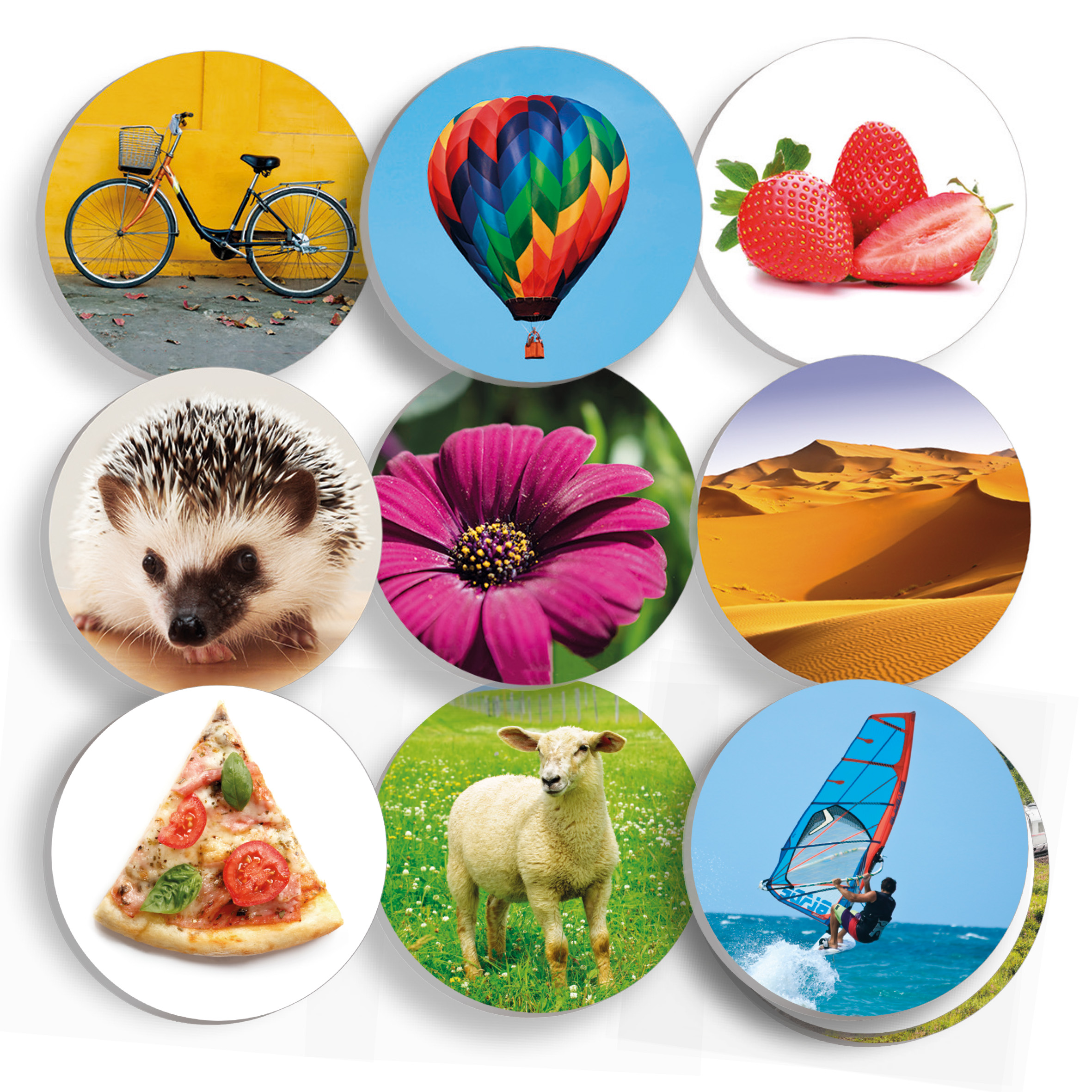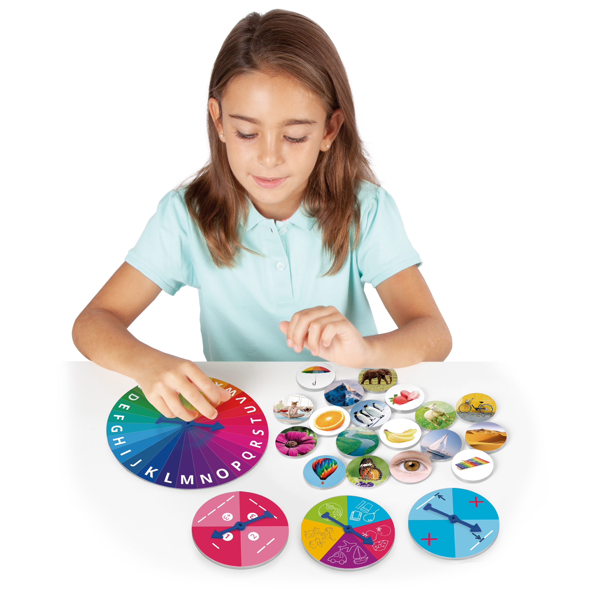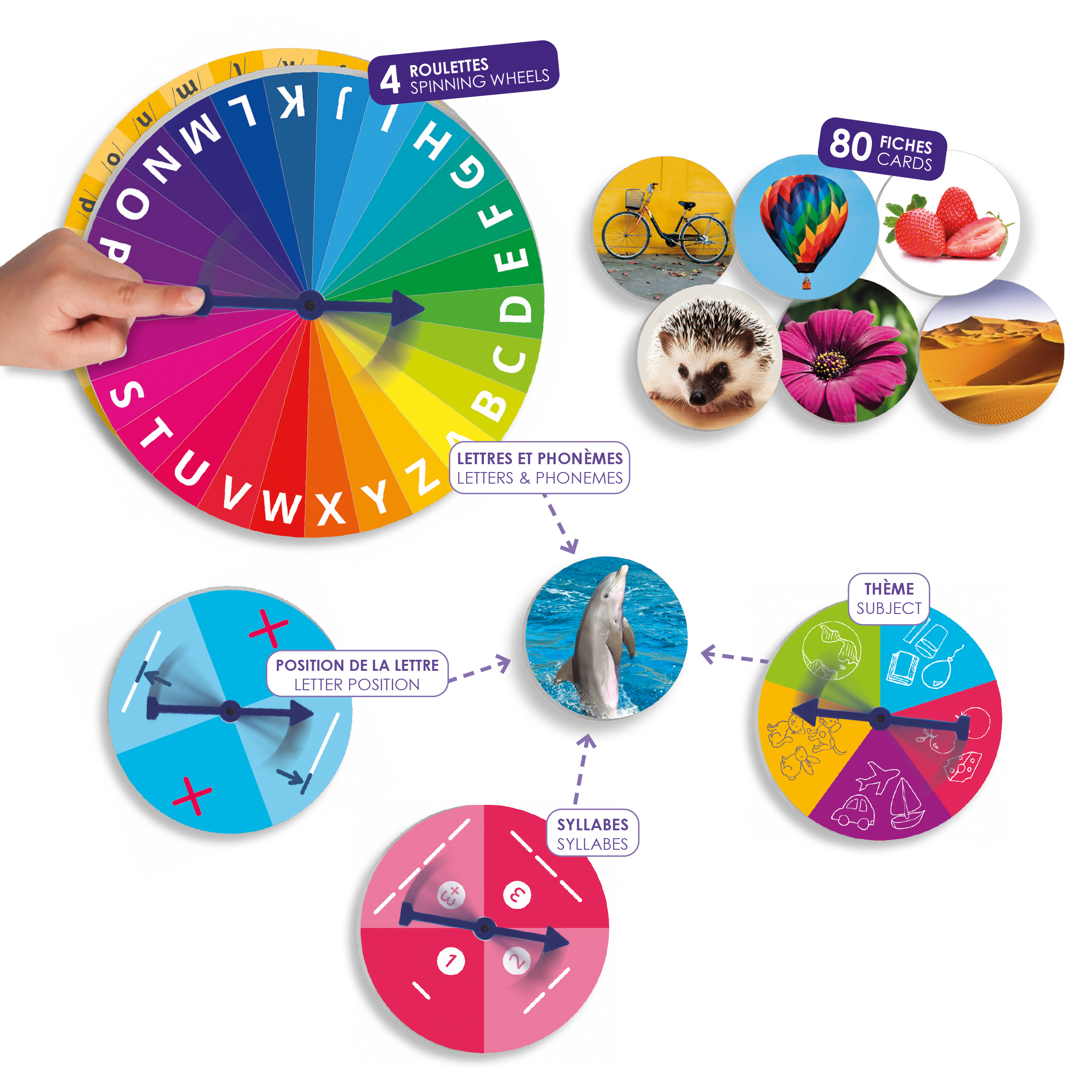 Olvasás-előkészítő rulett – hangfelismerés és diszlexiafejlesztés Ajánlott: óvodásoknak, kisiskolásoknak, sajátos nevelési igényű gyermekeknek és diszlexia-fejlesztéshez Fejlesztési területek: hangfelismerés, fonológiai tudatosság, beszéd- és kiejtésfejlesztés, szókincsbővítés, figyelem és koncentráció Ajánlott korosztály: 4–8 év Anyaga: magas minőségű karton 1 nagy rulett (17,3 cm) 3 kisebb rulett (11,5 cm) 80 db valóságos képes kártya (5 cm) 10 db karton csillagkorong (3 cm) 1 db filctoll