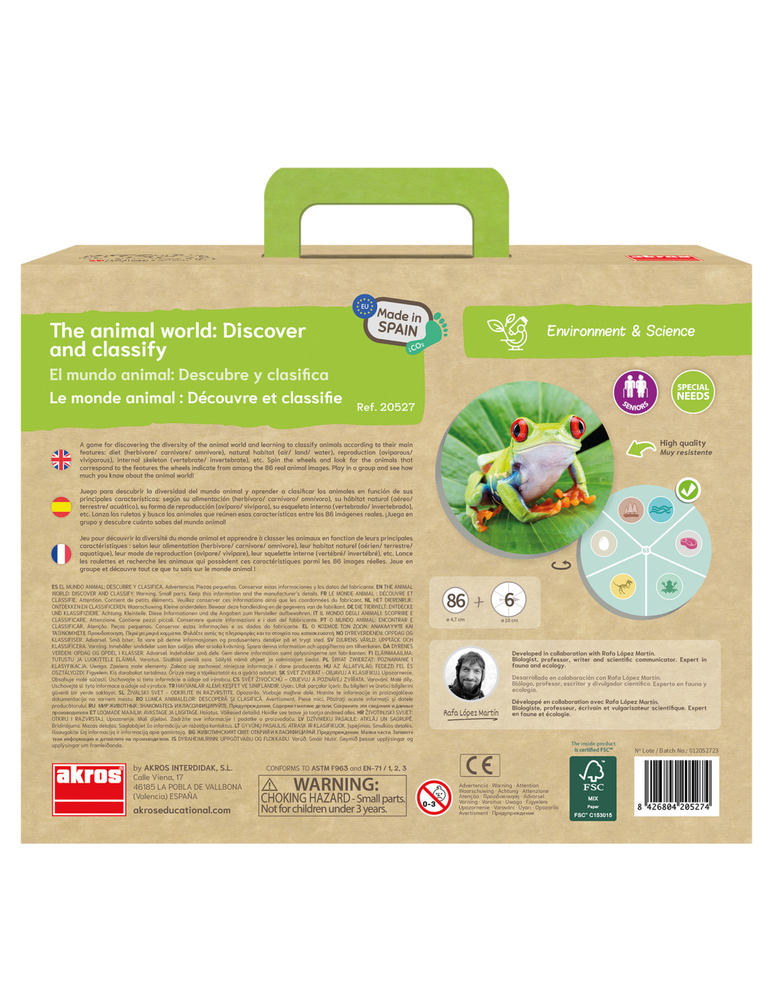 A játék az állatvilág megismerését és rendszerezését támogatja valódi képeken keresztül. Felhasználás: óvoda, fejlesztő környezet, iskolai előkészítés, otthoni játék Tartalom: 6 db karton rulett, 86 db kör alakú állatkártya valódi képekkel Rulett átmérő: 10 cm Kártyák mérete: 4,7 cm Anyag: kiváló minőségű karton (ECO)