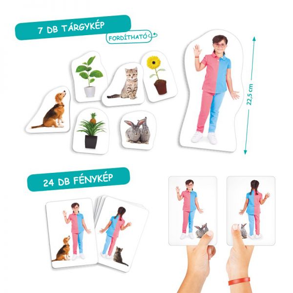 A gyerekek megismerkedhetnek a jobb- és a baloldal fogalmával saját maguk és mások szemszögéből. Ennek megkönnyítésére a fényképek a tárgyakkal ábrázolt emberalakokat elől- és hátulnézetből is bemutatják.