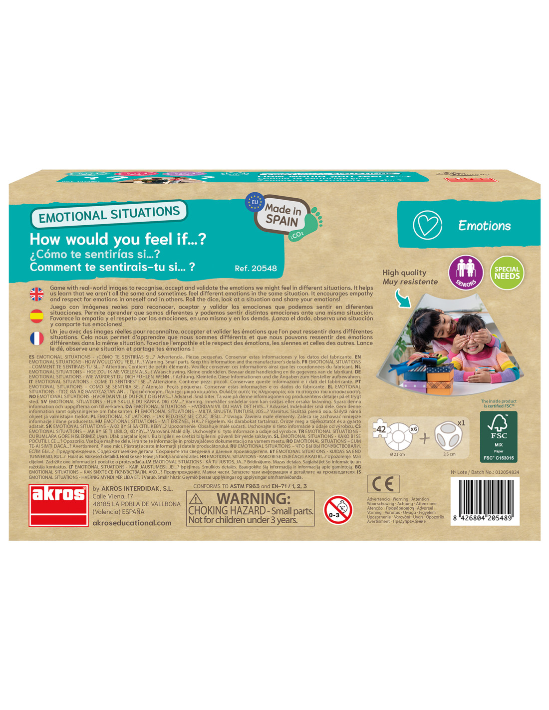 A játék az érzelmi intelligencia és az önismeret fejlesztését támogatja valós élethelyzetek feldolgozásán keresztül. Felhasználás: óvoda, fejlesztő környezet, csoportos foglalkozás, otthoni játék Tartalom: 36 db kartonkártya valódi képekkel, 6 db kör alakú kartonkártya, 1 db újrahasznosítható műanyag maxi dobókocka Kártyák mérete: 10,5x7 cm Kör kártyák mérete: 7,5 cm Dobókocka mérete: 3,5 cm Anyag: kiváló minőségű karton és újrahasznosítható műanyag