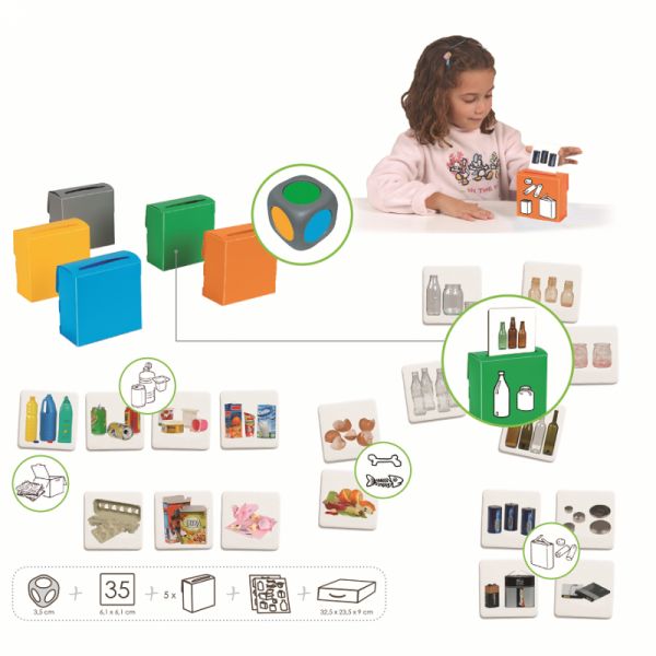 A készlet játékos formában tanítja meg a gyermekeknek a szelektív hulladékgyűjtés alapjait. A valósághű képek segítségével a gyerekek a megfelelő párokat keresve ismerkednek meg a különféle hulladéktípusokkal és a hozzájuk tartozó gyűjtőedényekkel.