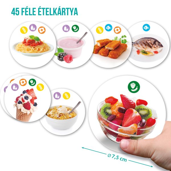 Tartalma: - 8 db 9 cm-es ételallergia és intolerancia kártya - 45 db 7,5 cm-es ételkártya - 12 db joker kártya. A doboz mérete: 24x19x7 cm