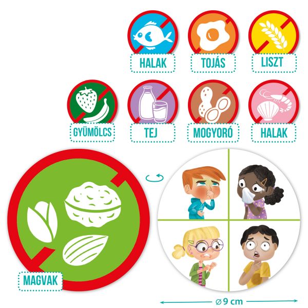 Tudjuk valójában, hogy mit eszünk? Melyik ételben találhatóak meg azok az allergén összetevők, amelyek az ételallergiát és az intoleranciát kiválthatják? Ez a kártyajáték megismerteti és megtanítja a gyermekeknek, hogy melyik étel milyen reakciót és tünetet válthat ki az emberekből!