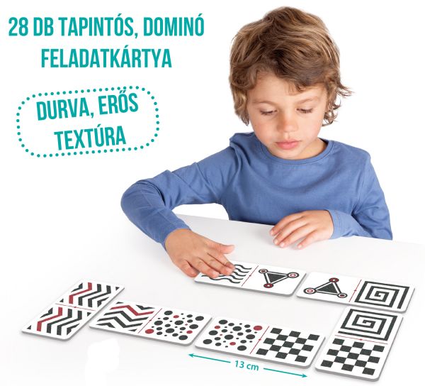 A durva textúrájú kétoldalas dominók segítségével a gyermekek megismerkedhetnek a legegyszerűbb formákkal és alakzatokkal. A terméket párosításra, érzékelésre, tapintásra is lehet használni. Mind a két oldala dominójátékként is funkcionál.