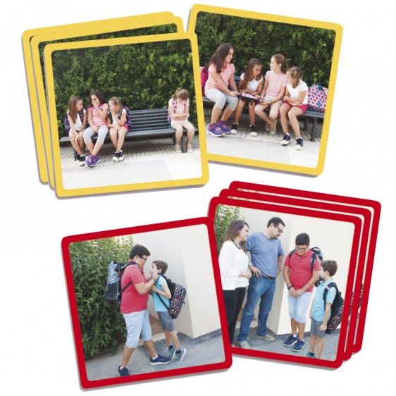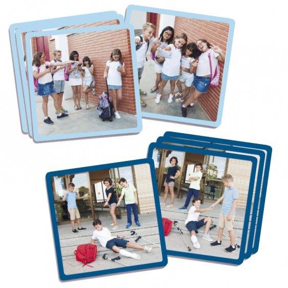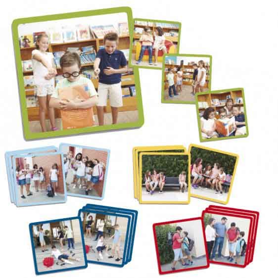 - 20 kártya nagy fotókkal, melyek az iskolai zaklatás és erőszak megelőzésére szolgálnak. A kártyák öt különböző sorozatba állíthatók, mindegyiken négy lépéssel. Mindegyik sorozatnak más színű széle van, hogy könnyebben lehessen felismerni és csoportosítani a kártyákat ugyanazon sorozaton belül.