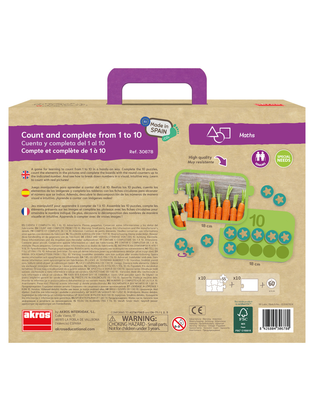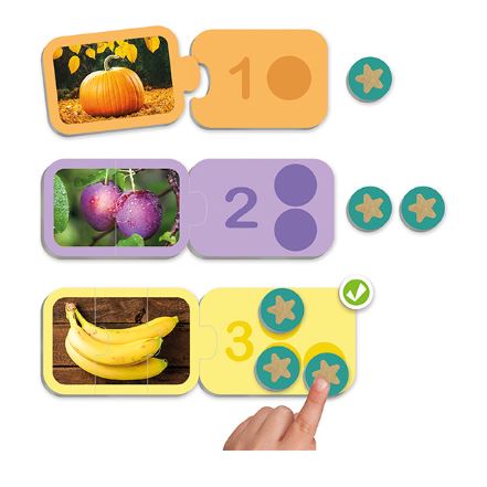 Típus: számolást fejlesztő kirakós és számlálójáték Felhasználás: óvoda, fejlesztő környezet, otthoni játék Tartalom: 10 db progresszív kirakós, 10 db kartonlap, 60 db kör alakú kartonkártya, 8 db filctoll Méret: 18x12 cm Anyag: kiváló minőségű karton Fejlesztési területek: figyelem és koncentráció, finommotoros készségek, számfogalom 1-10-ig, vizuális gondolkodás, szenzoros fejlődés