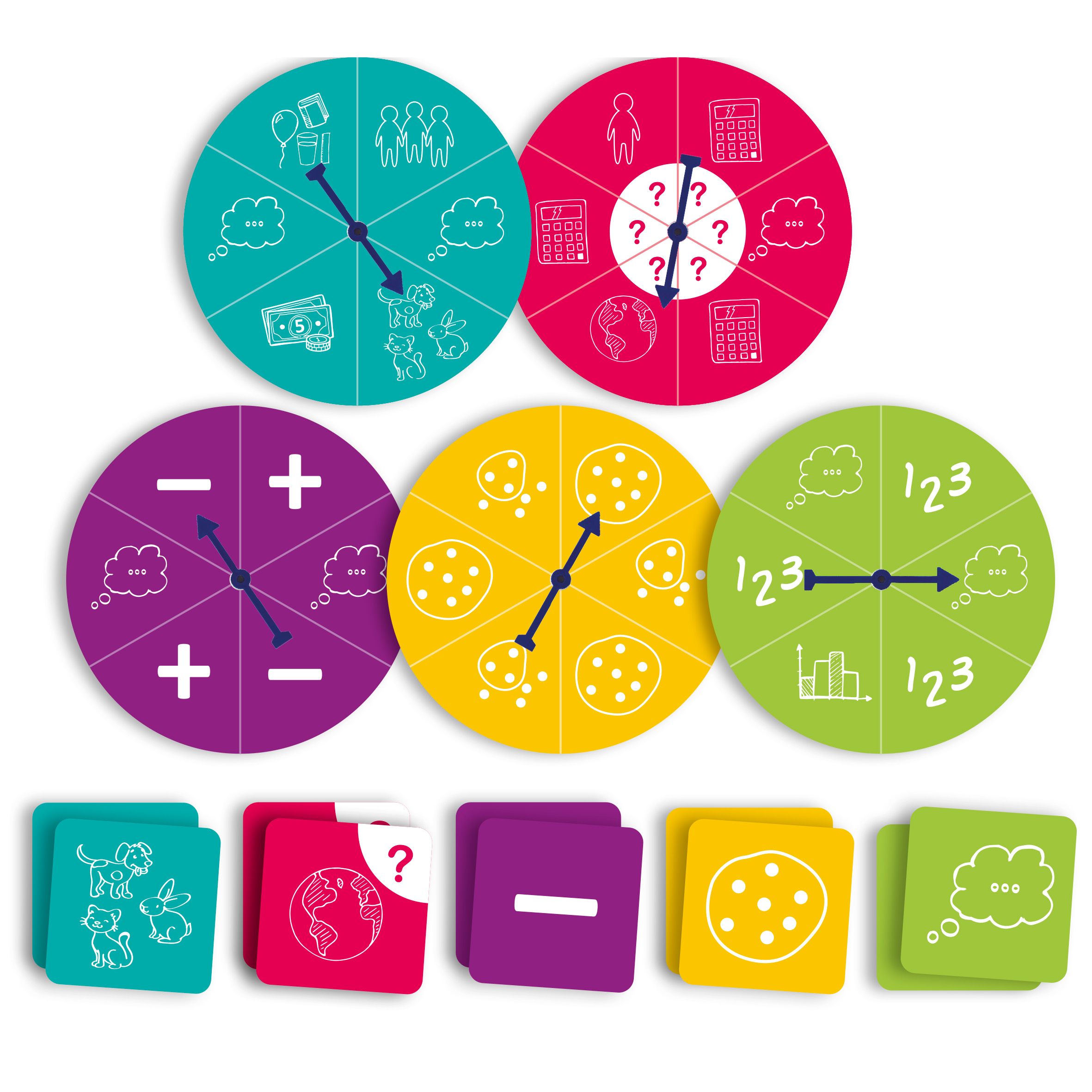 Kreatív matekfeladat-alkotó készlet – gondolkodj, számolj, oldd meg! Tartalma: 5 db rulett (18 cm átmérő), 42 db kartoncsempe (5,5x5,5 cm) Anyaga: prémium minőségű, tartós karton Ajánlott korosztály: 6–14 év és különleges nevelési igényű gyermekek számára is megfelelő Fejlesztési területek: figyelem, koncentráció, logikus gondolkodás, problémamegoldás, memória, számolási készség, kreatív matematikai gondolkodás