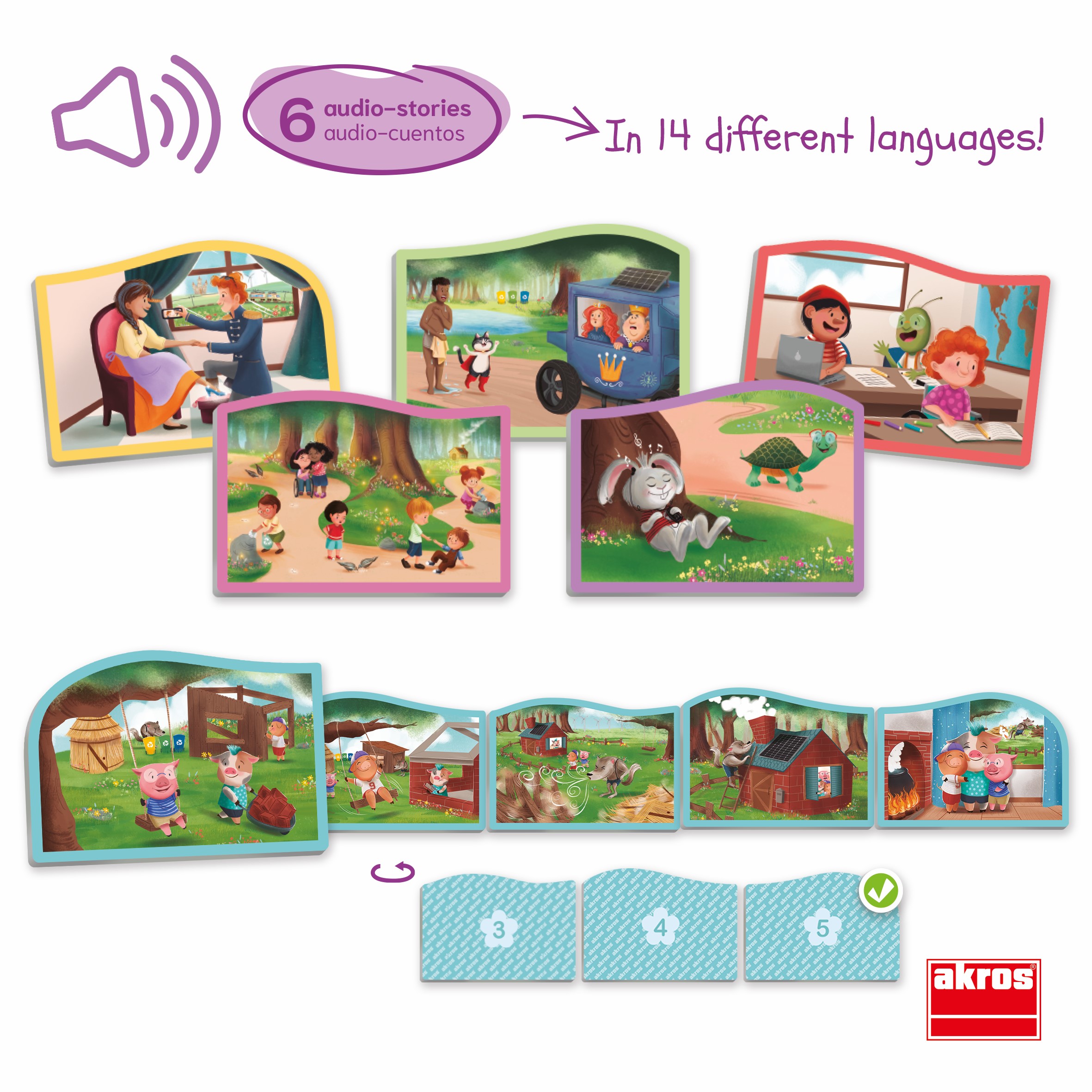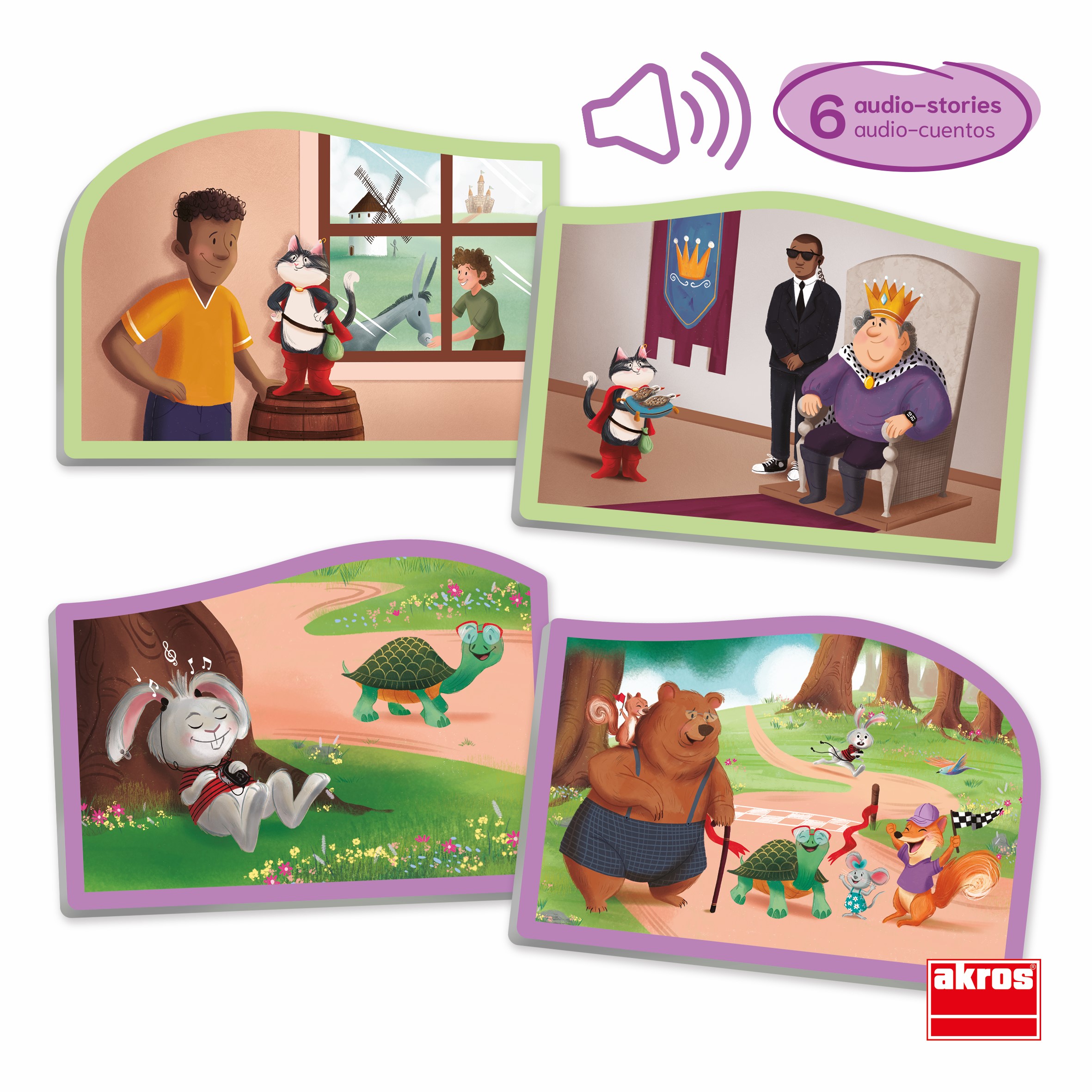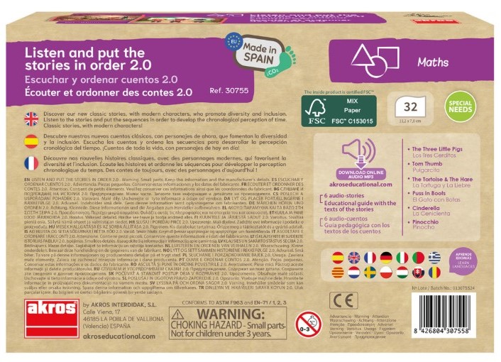A doboz tartalma: összesen 6 mese jeleneteit tartalmazó 32 db színes karton kártya. Mérete: 11x8 cm. Letölthető hanganyaggal A különböző mesék jeleneteit tartalmazó kártyáknak eltérő színű keretük van, így könnyen megkülönböztethetőek. -A Három kismalac: 5 db kék keretezésű kártya -Hüvelyk Matyi: 5 db rószaszín keretezésű kártya -A Teknős és a Nyúl: 5 db lila keretezésű kártya -A Csizmás Kandúr: 5 db zöld keretezésű kártya -Hamupipőke: 6 db sárga keretezésű kártya -Pinokkio: 6 db piros keretezésű kártya.