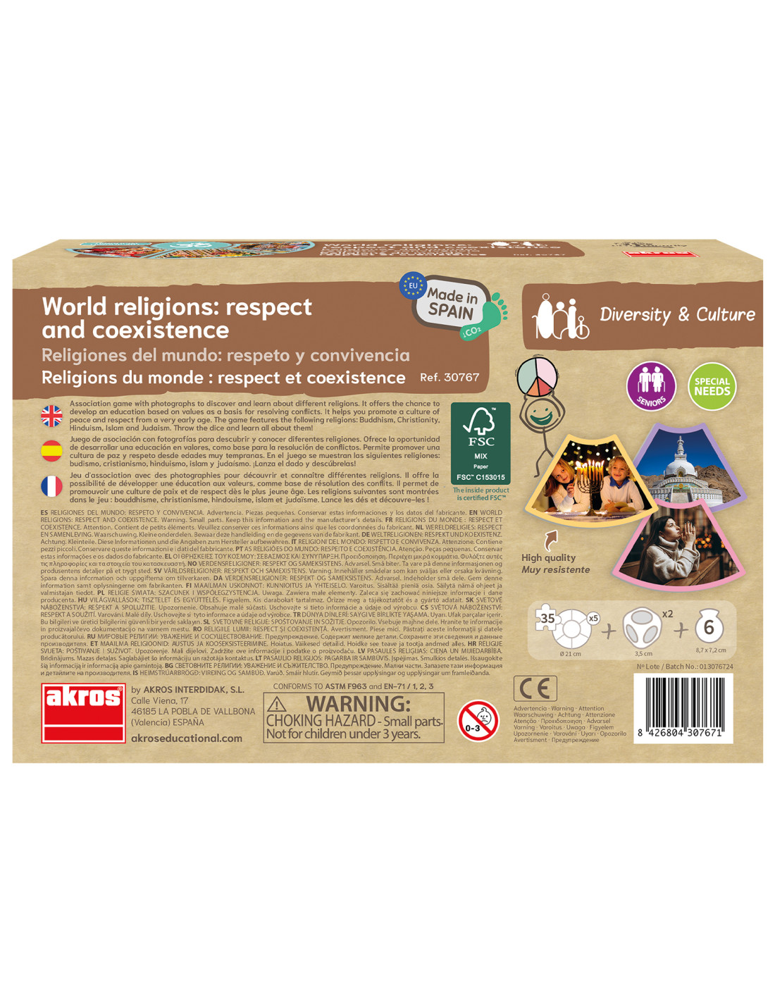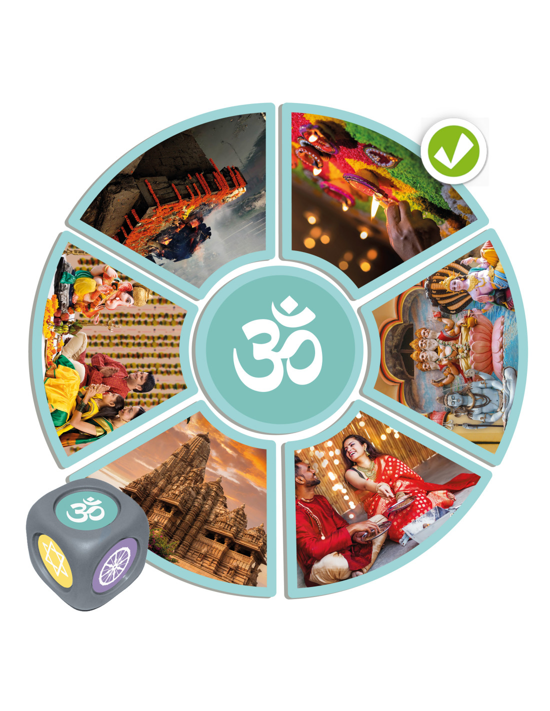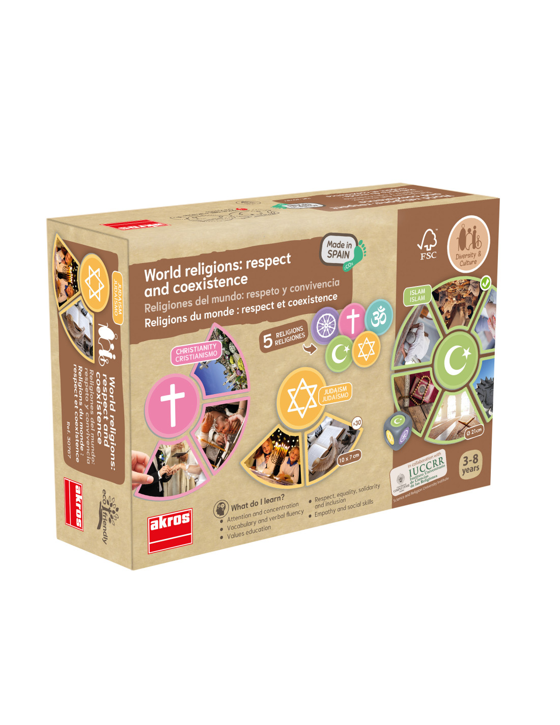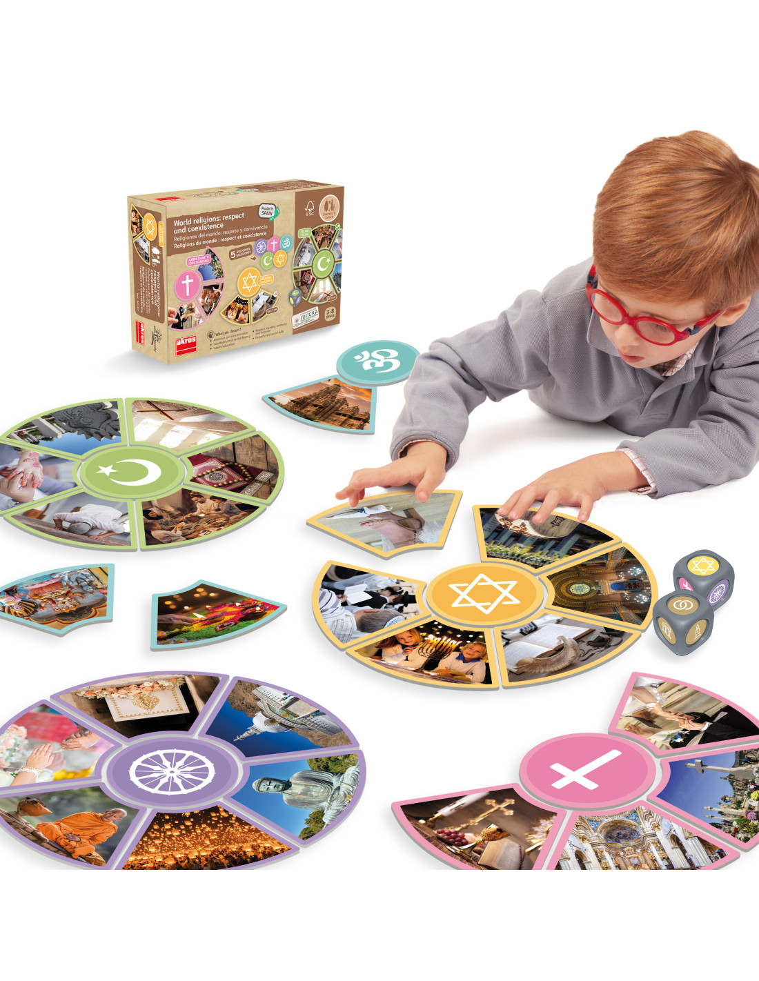 Vallások és kultúrák – ismeretterjesztő játék az elfogadásról Tartalma: 30 db prémium kartonkártya valós fotókkal (10x7 cm), 5 db karton körkártya, 6 db karton alakos kártya (8,7x7,2 cm), 2 db újrahasznosítható műanyag maxidobókocka (3,5 cm élhossz) Anyaga: magas minőségű karton és újrahasznosítható műanyag Ajánlott korosztály: 3–8 év; különleges nevelési igényű gyermekek és idősek számára is ideális Fejlesztési területek: figyelem, koncentráció, empátia, szociális készségek, értékek megértése, szókincsfejlesztés, elfogadás és inklúzió