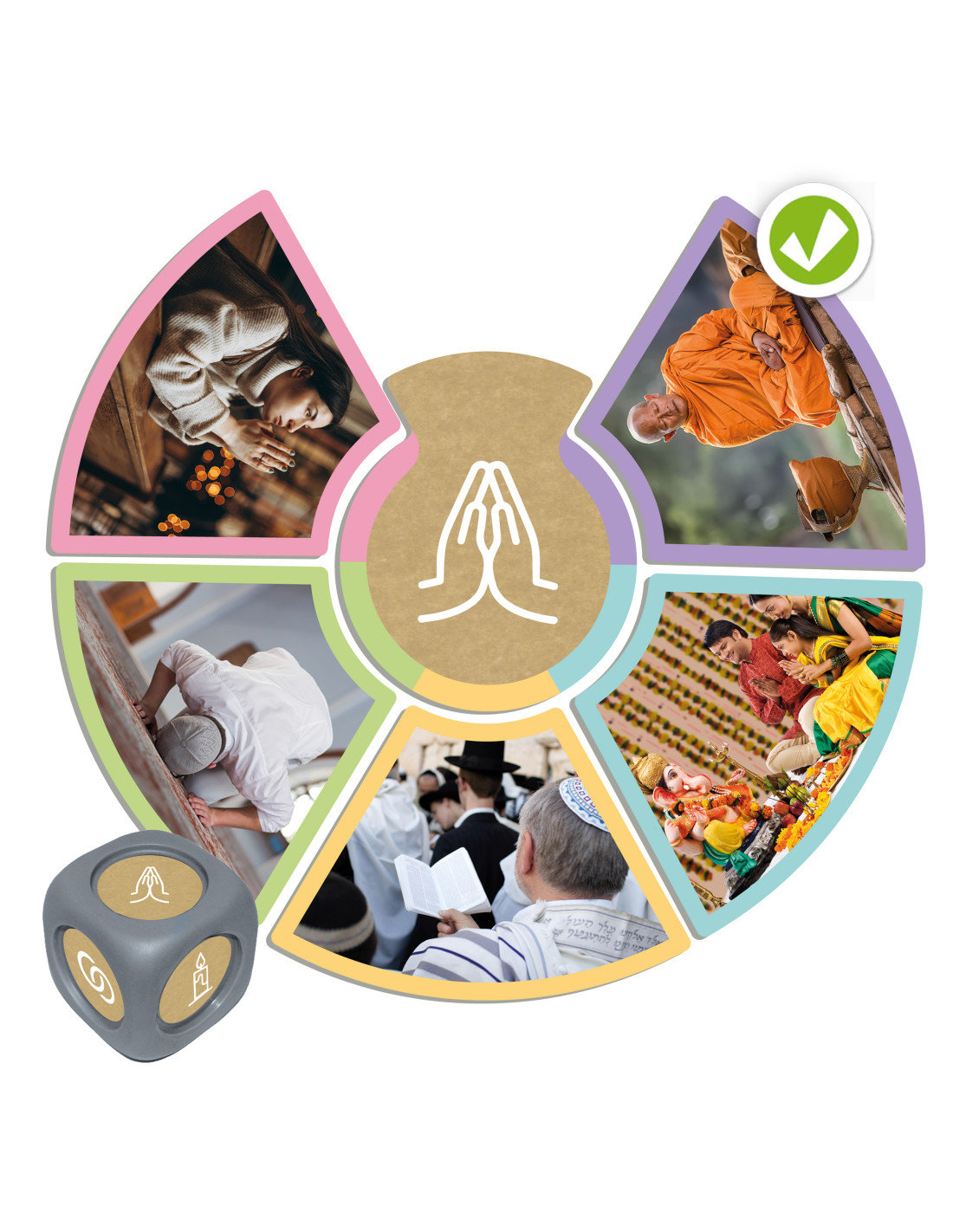 Ez a különleges asszociációs játék valódi fotókkal ismerteti meg a gyerekeket a világ nagy vallásaival – a buddhizmussal, kereszténységgel, hinduizmussal, iszlámmal és judaizmussal. Segít a tisztelet, az együttérzés és a különbözőségek elfogadásának fejlesztésében, miközben értékeket közvetít és elősegíti a békés konfliktuskezelést. A dobókocka segítségével játékosan fedezhetők fel a vallások jellemzői, szokásai és kulturális elemei, így a gyerekek könnyedén bővíthetik szókincsüket és ismereteiket a világ sokszínűségéről.