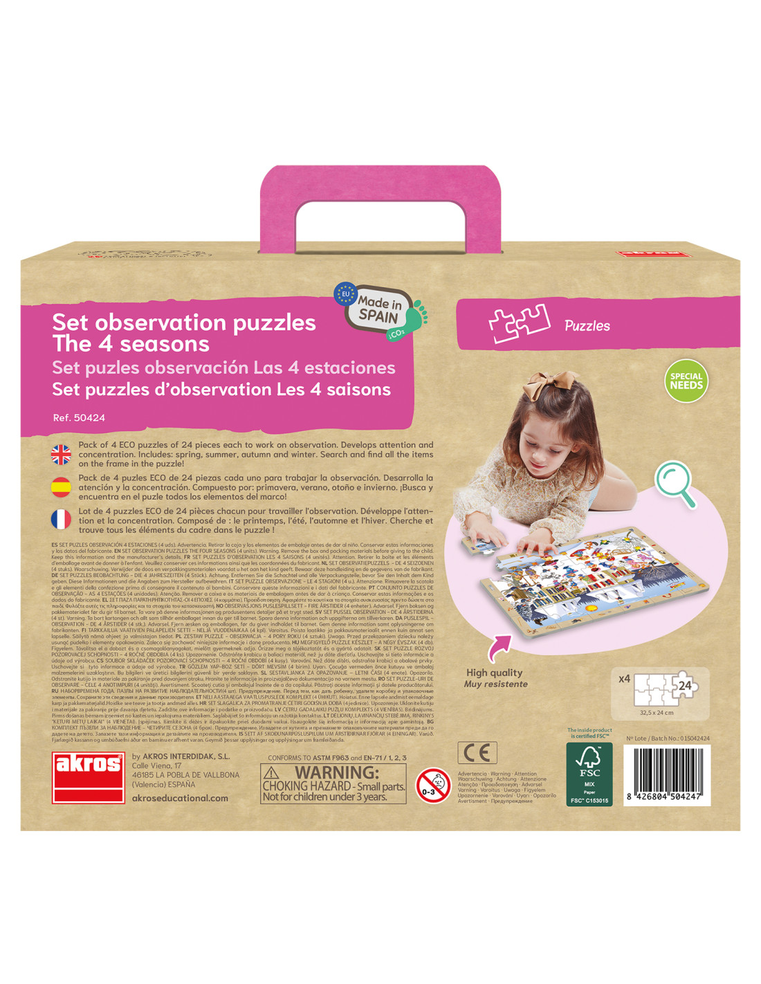 A négy különálló puzzle lehetőséget ad az évszakok megfigyelésére és összehasonlítására. Felhasználás: óvoda, bölcsőde, fejlesztő környezet, otthoni játék Tartalom: 4 db 24 darabos megfigyelő puzzle (tavasz, nyár, ősz, tél) Darabszám: 4x24 db Puzzle méret: 32x24 cm Anyag: kiváló minőségű karton (ECO) Ajánlott életkor: 3–7 év Méret: 32x24 cm