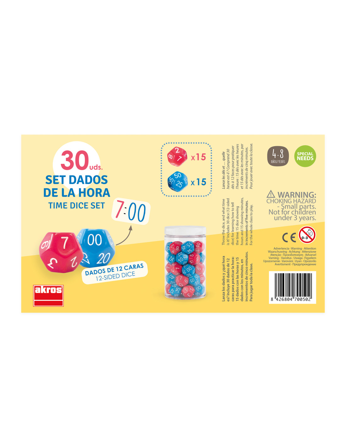 Az időtanuló dobókocka készlet játékos módon segíti a gyerekeket az óra leolvasásának gyakorlásában. A 12 oldalú kockák külön jelölik az órákat és a perceket, így könnyen megérthetővé válik az idő felépítése. Ideális eszköz az osztálytermi közös munkához, logikai gondolkodás és időérzék fejlesztéséhez. A dobókockákkal a gyerekek önállóan vagy csoportban is gyakorolhatnak.