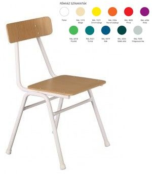 Elektrosztatikus porszórással festett. Acélcső vázszerkezet átmérője: 18 mm. Ülőke és támla: lakkozott, idom-préselt réteglemez. Lábak végén műanyag végzáró dugó.