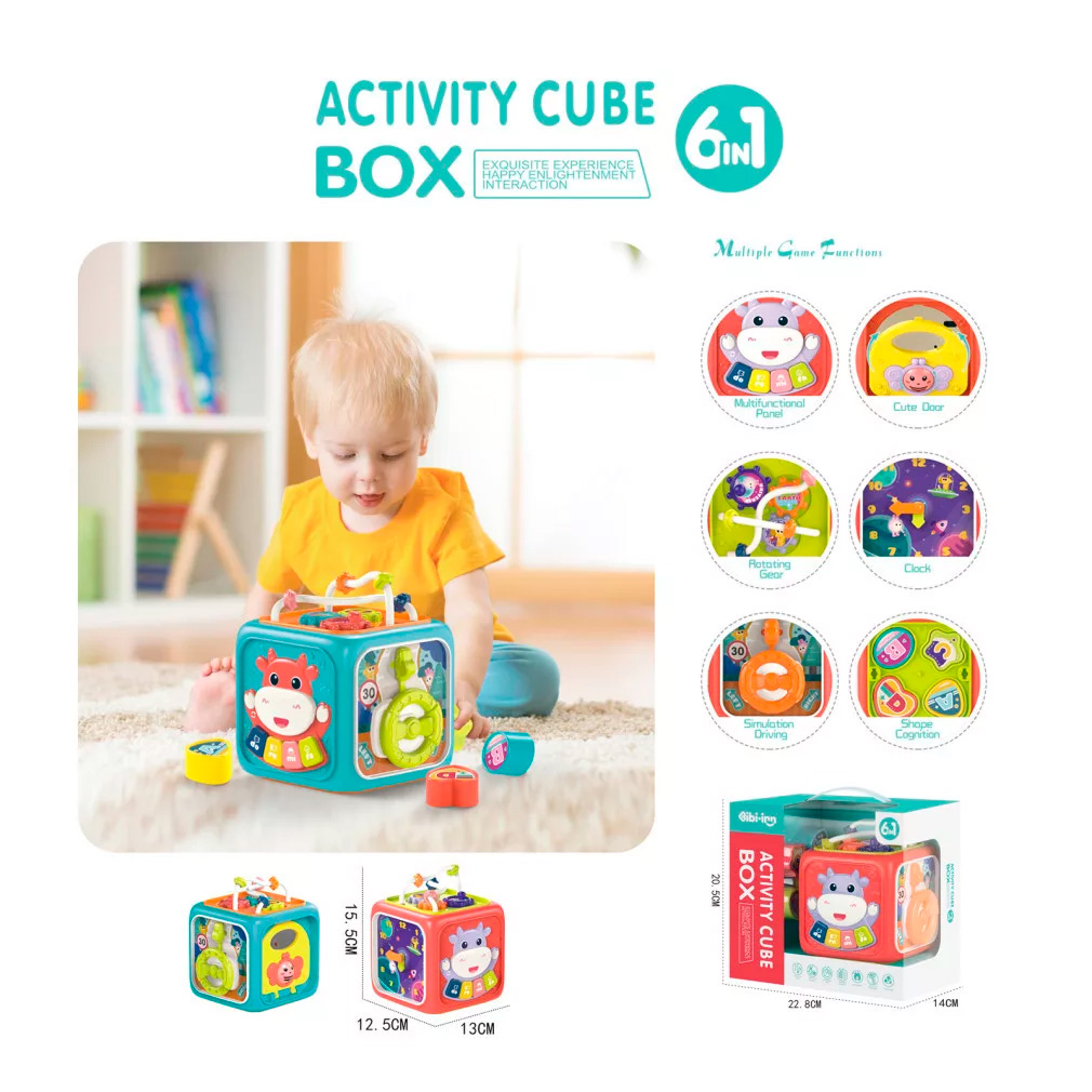 A 6 az 1-ben készségfejlesztő activity kocka műanyagból készült, mérete kb 13 x 13 x 16 cm. Hat oldala különböző funkciókat tartalmaz (forgatható képek, fogaskerekek, formabedobó, nyitható ajtók, gombnyomók), melyek játékos formában fejlesztik a gyermekek finommotorikáját,