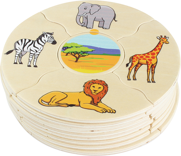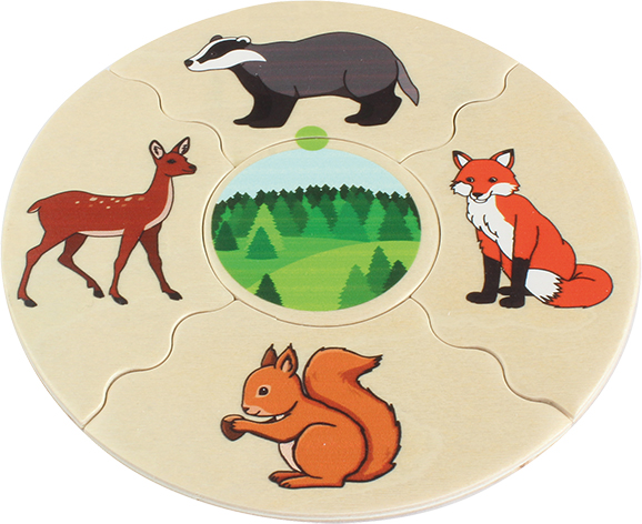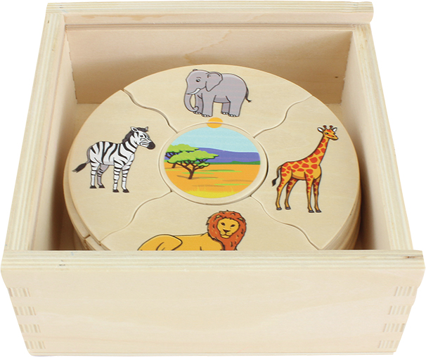 Tartalma: - 45 db-os fa puzzle készlet fadobozban A rejtvény segítségével a gyerekek 36 különböző állatot és azok megszokott életkörnyezetét ismerhetik meg Doboz mérete: 15x15x6 cm