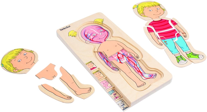 A Beleduc rétegpuzzle játéka izgalmas módon mutatja be az emberi test összetételét, 5 különböző rétegre bontva azt. Csontrendszer, belsőszervek, izomzat, keringési hálózat, bőr és ruházat.