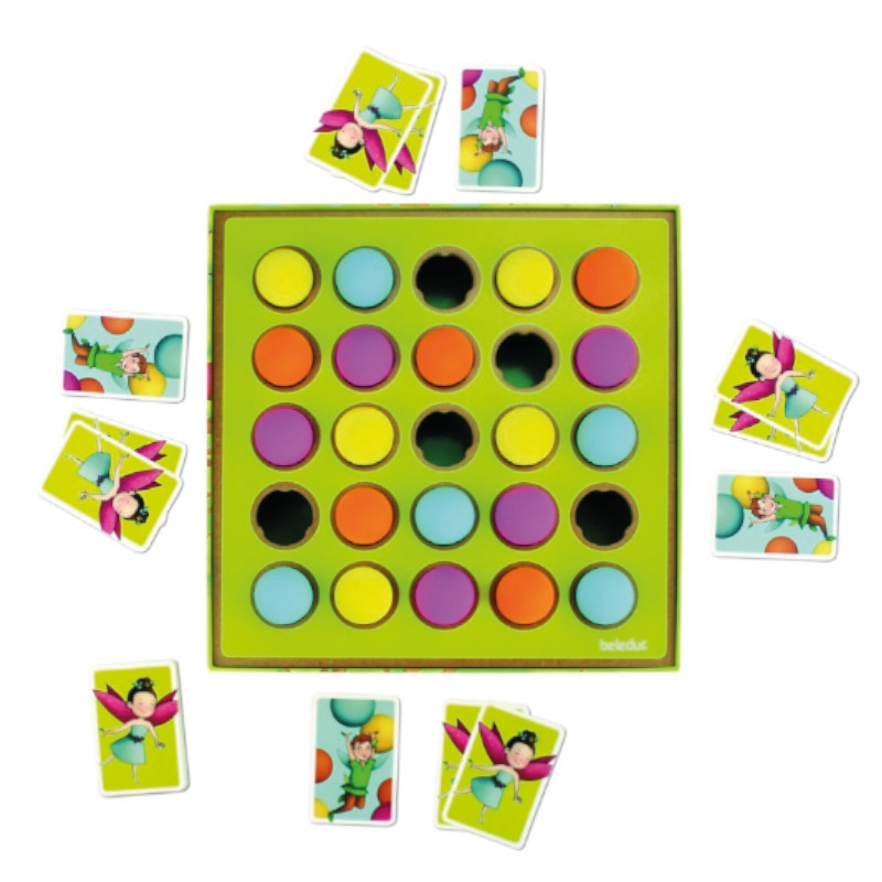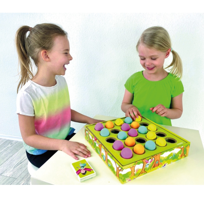Tartalma: - 1 db fa játéktábla, 25 lyukkal (a doboz egyben a játéktábla alapja) - 20 db kemény szivacs labda, 4 különböző színben (5 db kék, 5 db magenta, 5 db sárga, 5 db narancs) - 4 db labda szín választó kártya - 34 db akció kártya A doboz mérete: 31x31x6,5 cm Játékidő: kb. 15 perc