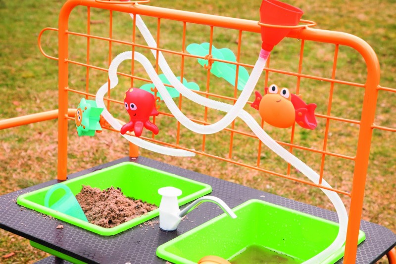 A munkaasztalon - a két mély tálcában - rengeteg hely van a víz és homok számára is.