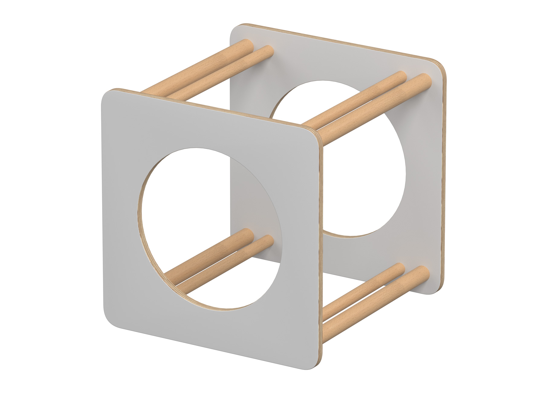 Kör ablakú mászó kocka nyírfa rétegelt lemezből és tömör bükkfából, fehér színben. A kocka két oldalán kör alakú nyílások találhatók, míg a másik két oldalán 2x2 pár rúd biztosítja a mászáshoz szükséges támaszt. Ez a kialakítás különféle mozgásformák gyakorlására ad lehetőséget, miközben támogatja a gyermekek motorikus készségeinek és koordinációjának fejlődését. Mérete: 59x59x59 cm