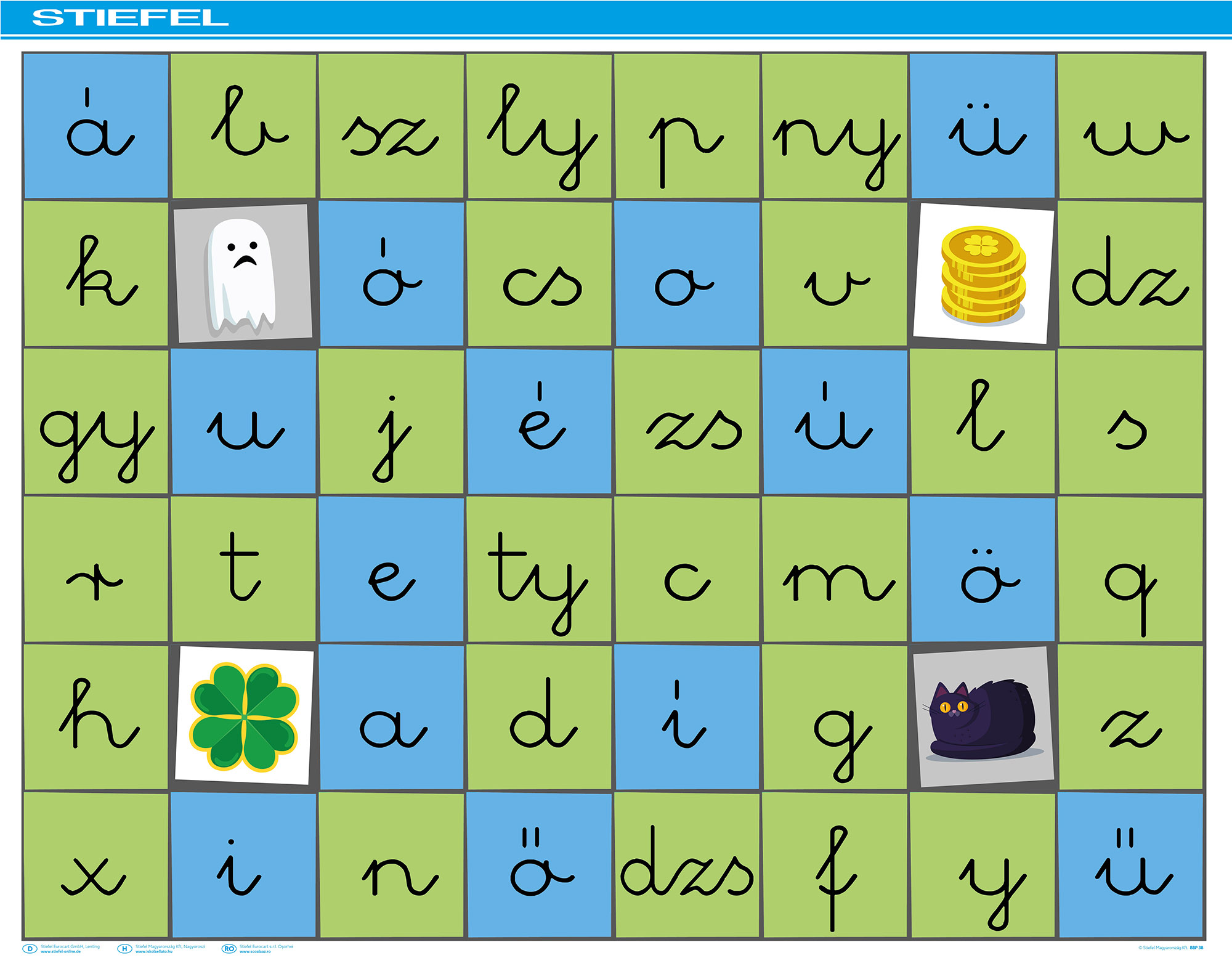 Írott kisbetű – magán- és mássalhangzók különböző színnel.