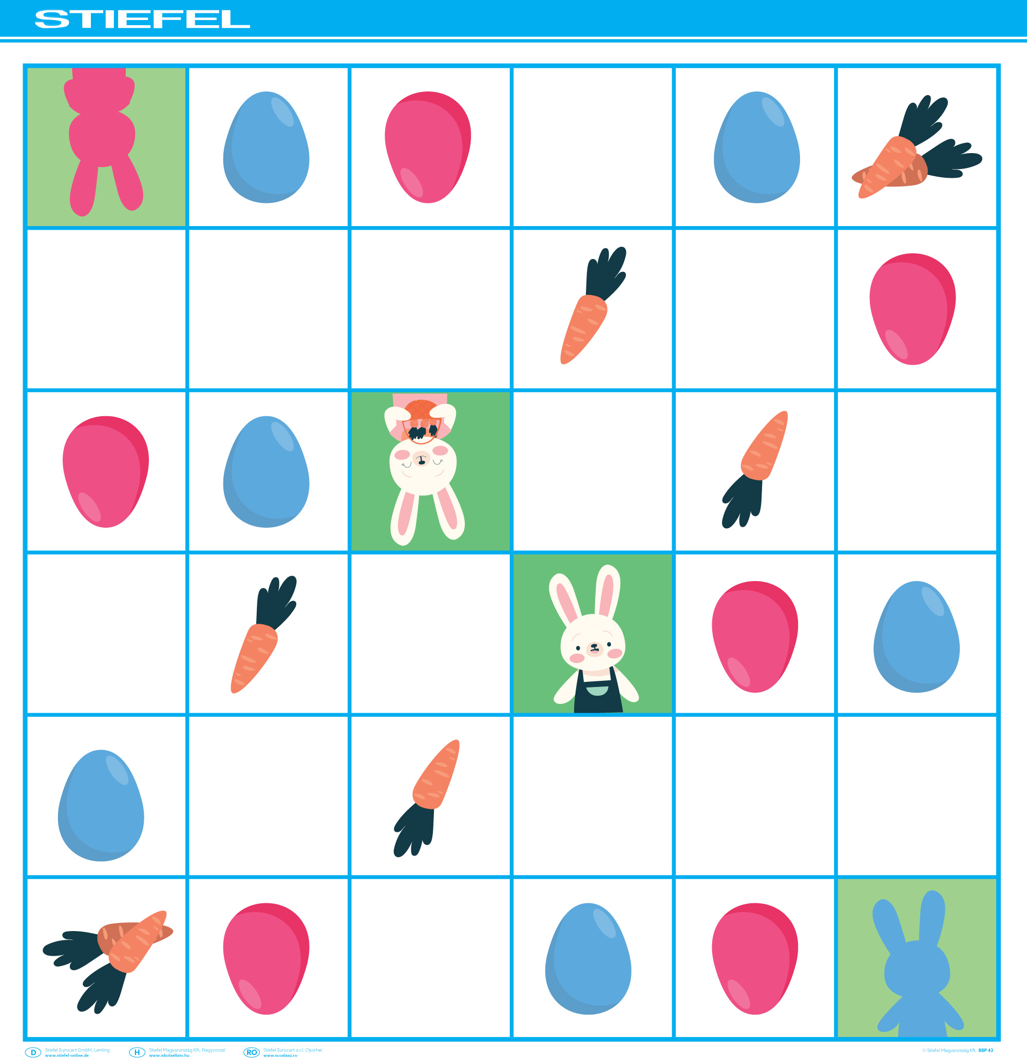 Az új húsvéti társas kaland pályák az első olyan Bee-Bot gyakorlópályák a kollekciónkban, amelyeken akár több padlórobot is versenyezhet. Ezek a pályák az eddig megszokott módon is használhatóak, de a páros, illetve négy szereplős társasjátékszerű elrendezés sok új játék és feladat lehetőséget kínál. A cél minél több, megfelelő színű tojás begyűjtése a lehető legrövidebb útvonalon.