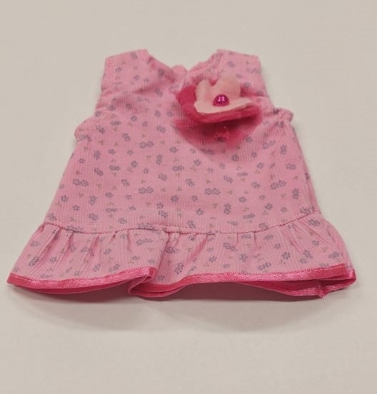 Egy darab 24-32 cm méretű játékbabára való ruha, rózsaszín alapon kék virágmintás, nagy rózsaszín, rávarrt virággal díszített ujjatlan ruhácska. A babázás, szerepjáték közben fejlődik a gyerekek szociális készsége, empátiája. A manufakturális gyártásból adódóan előfordulhat, hogy a ruhák színe eltérhet a képen láthatótól.