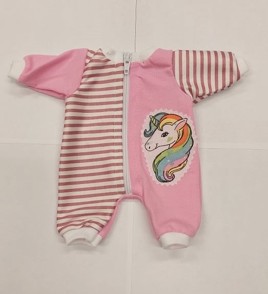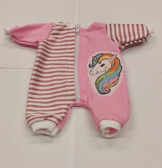 24-31 cm méretű játékbabára való ruha, Rugdalódzó, melynek egyik oldala és egyik ujja rózsaszín-fehér keresztben csíkos, míg másik oldala és másik ujja rózsaszín. Rózsaszín oldalán rávarrt Unikornis díszítés látható. Hosszában cipzáras. A manufakturális gyártásból adódóan előfordulhat, hogy a ruhák színe eltérhet a képen láthatótól. A termék mérete: 18 cm