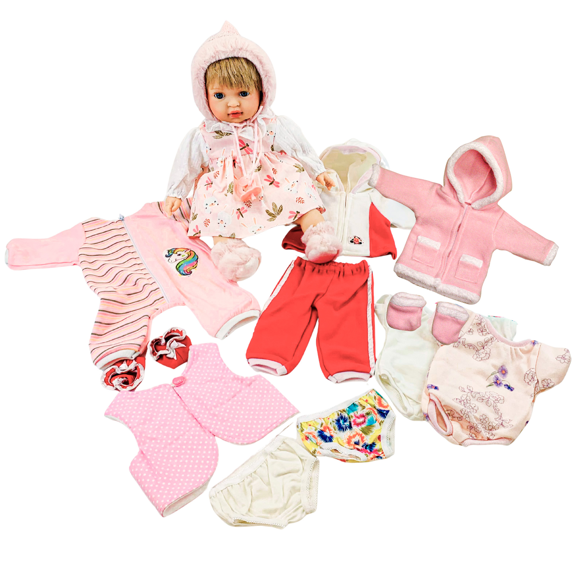 Babaruhaszett Őszi-Téli kollekció 37-50 cm lány játékbabához Tartalma: BV 001 – Masnis babacipő BV 100 – Bugyi szett - 2 db BV 110L – Body szett - 2 db, lányos BV 221L – Kapucnis szabadidő együttes, lányos BV 400L – Bélelt mellény, lányos BV 500L – Szőrmés kabát csizmával, lányos BV 505L – Tipegő, lányos