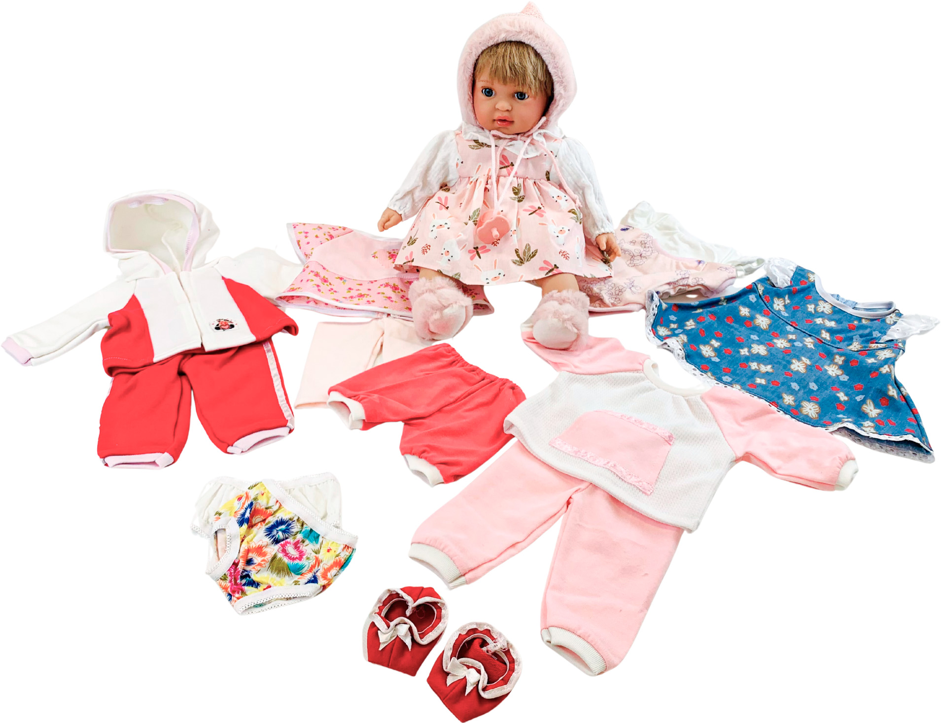 Babaruhaszett Tavaszi-Nyári kollekció 37-50 cm lány játékbabához Tartalma: BV 001 – Masnis babacipő BV 010 – Farmer Ruha BV 100 – Bugyi szett - 2 db BV 110L – Body szett - 2 db, lányos BV 221L – Kapucnis szabadidő együttes, lányos BV 222L – Szabadidős együttes, lányos BV 223L – Tunikás együttes, lányos