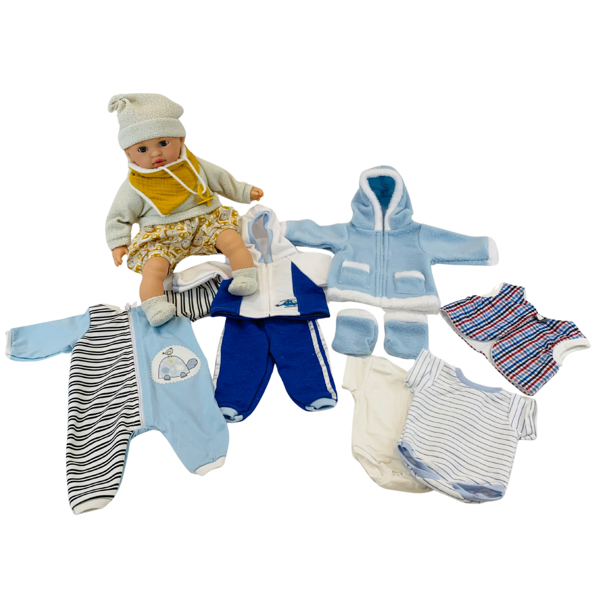 Babaruhaszett Őszi-Téli kollekció 37-50 cm fiú játékbabához Tartalma: BV 110F – Body szett - 2 db, fiús BV 221F – Kapucnis szabadidő együttes, fiús BV 400F – Bélelt mellény, fiús BV 500F – Szőrmés kabát csizmával, fiús BV 505F – Tipegő, fiús