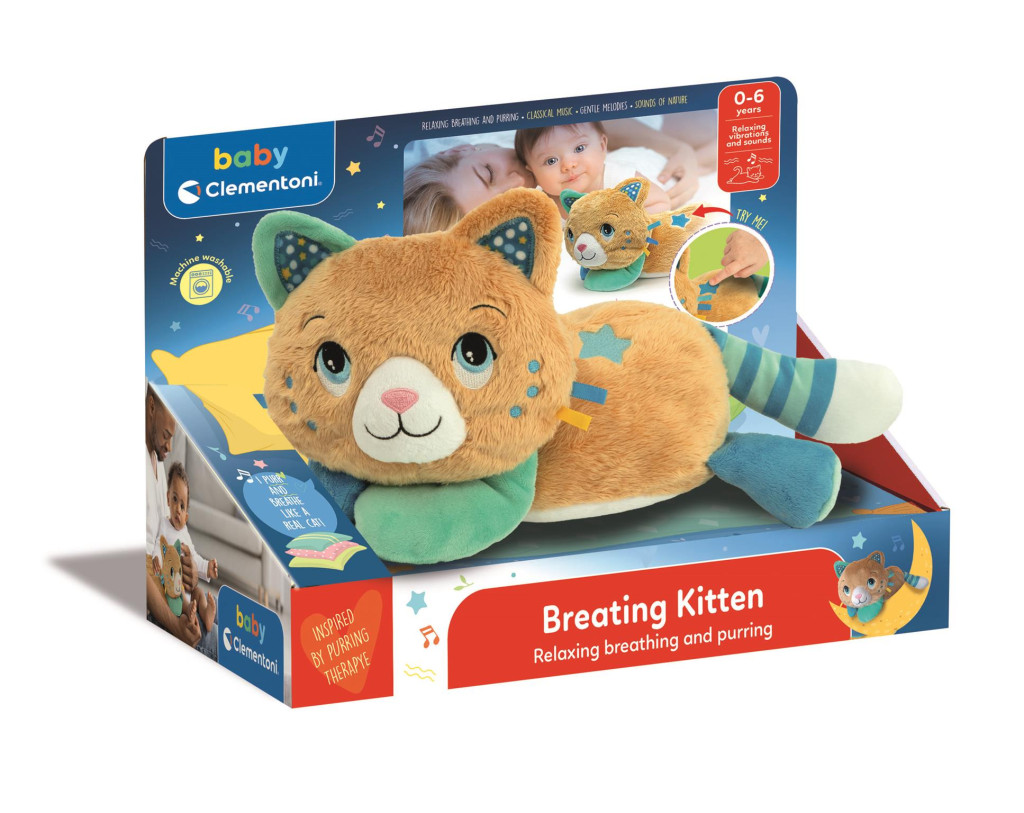 A Baby Clementoni elalvást segítő doromboló, szuszogó plüss cica a kisgyermekek megnyugtatására és elaltatására készült.
