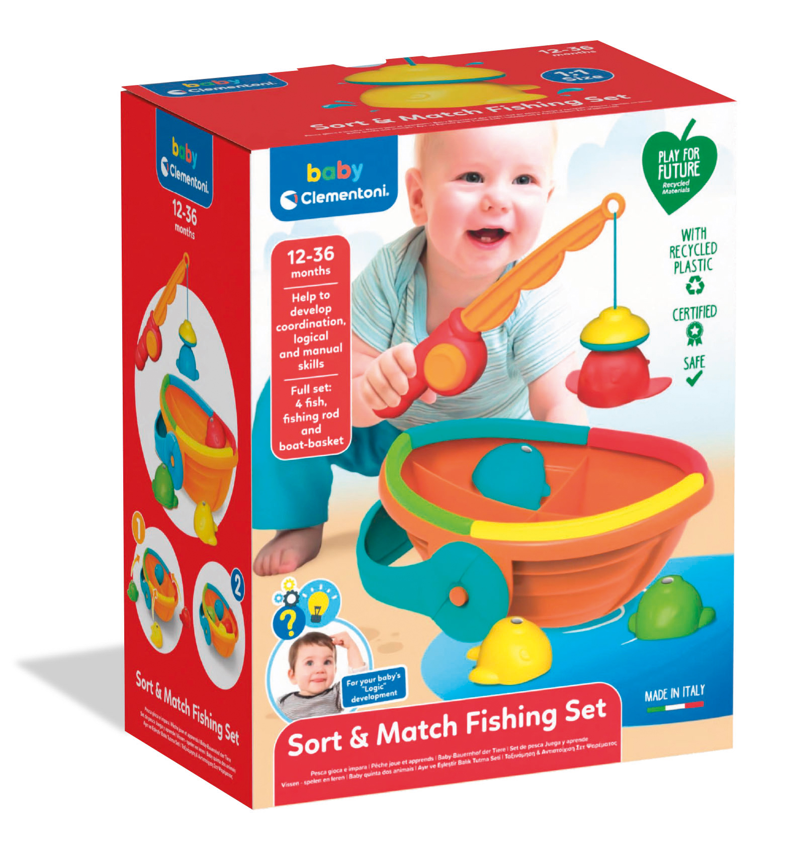 A doboz mérete: 24x19,5x11,5 cm Tartalma: 4 db különböző színű halacska, mágneses horgászbot és egy csónak alakú rekeszes kisvödör. 12 hónapos korú gyermekek használatára CE minősítéssel ellátva! 100%-ban újrahasznosított műanyagból készült!