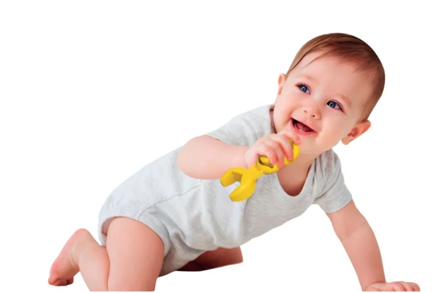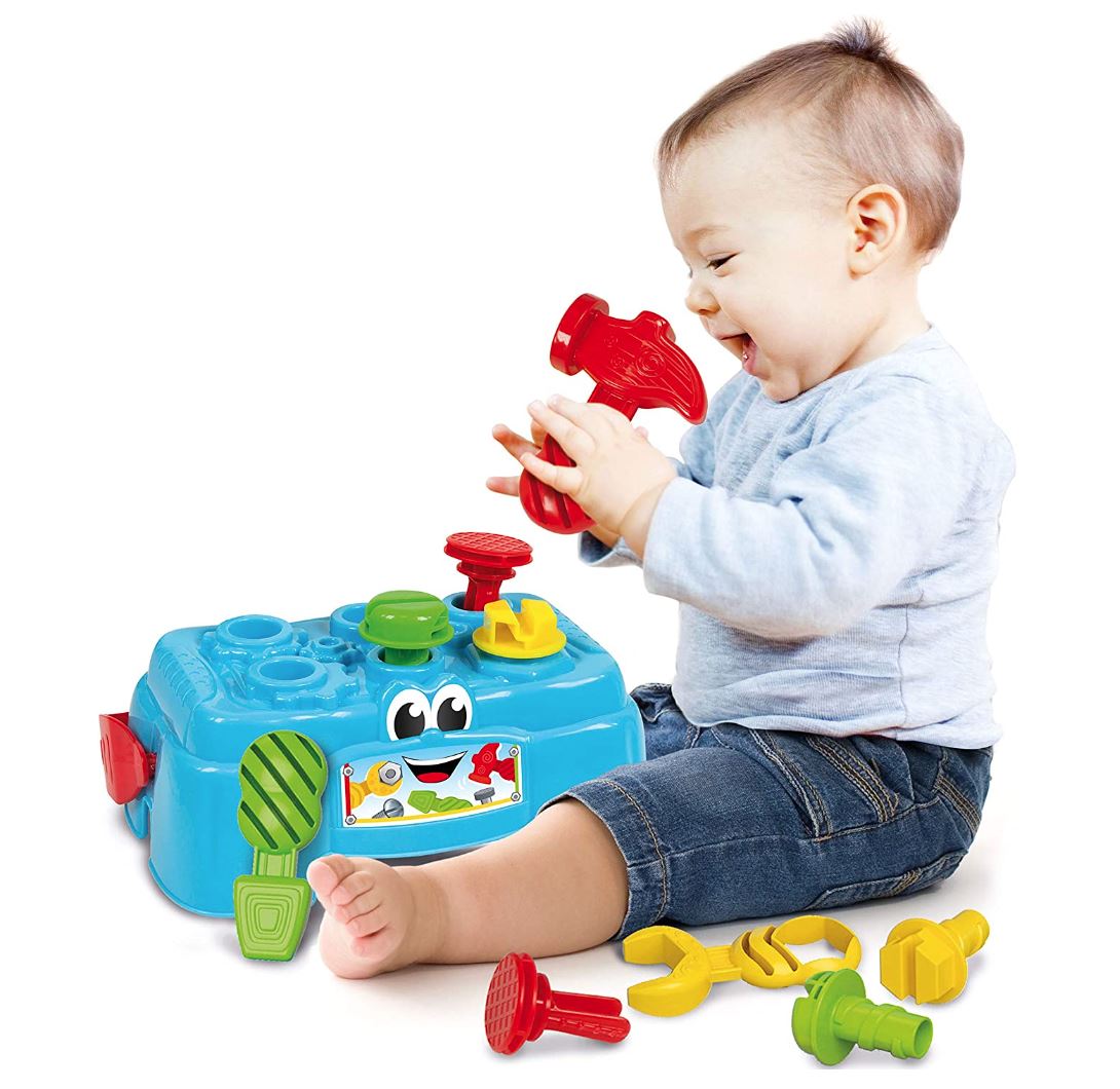 A munkaasztal kalapáccsal, csavarhúzóval és csavarkulccsal érkezik, amely élénk színeinek köszönhetően biztosan felkelti majd a babák figyelmét.