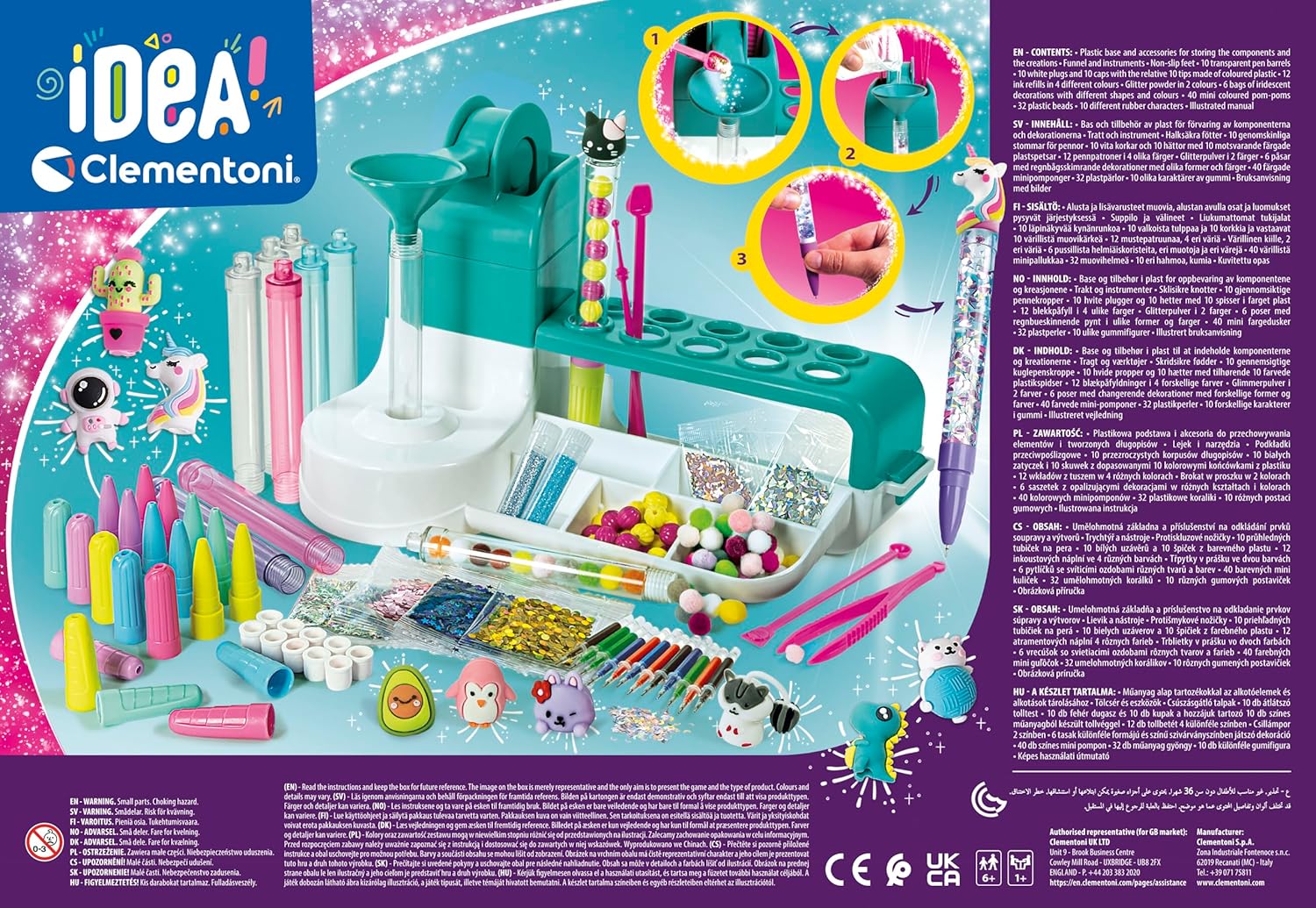 Ajánlott kor: 6+ év Tartalma: több mint 50 kiegészítő, tolltestek, tölcsér, dekoranyagok, matricák, pomponok, figurás tollvégek, rendszerező állomás Készíthető tollak száma: akár 10 egyedi toll Fejlesztés: kreativitás, finommotorika, önkifejezés Anyaga: műanyag és dekorációs alapanyagok Használat: otthoni kreatív tevékenységekhez
