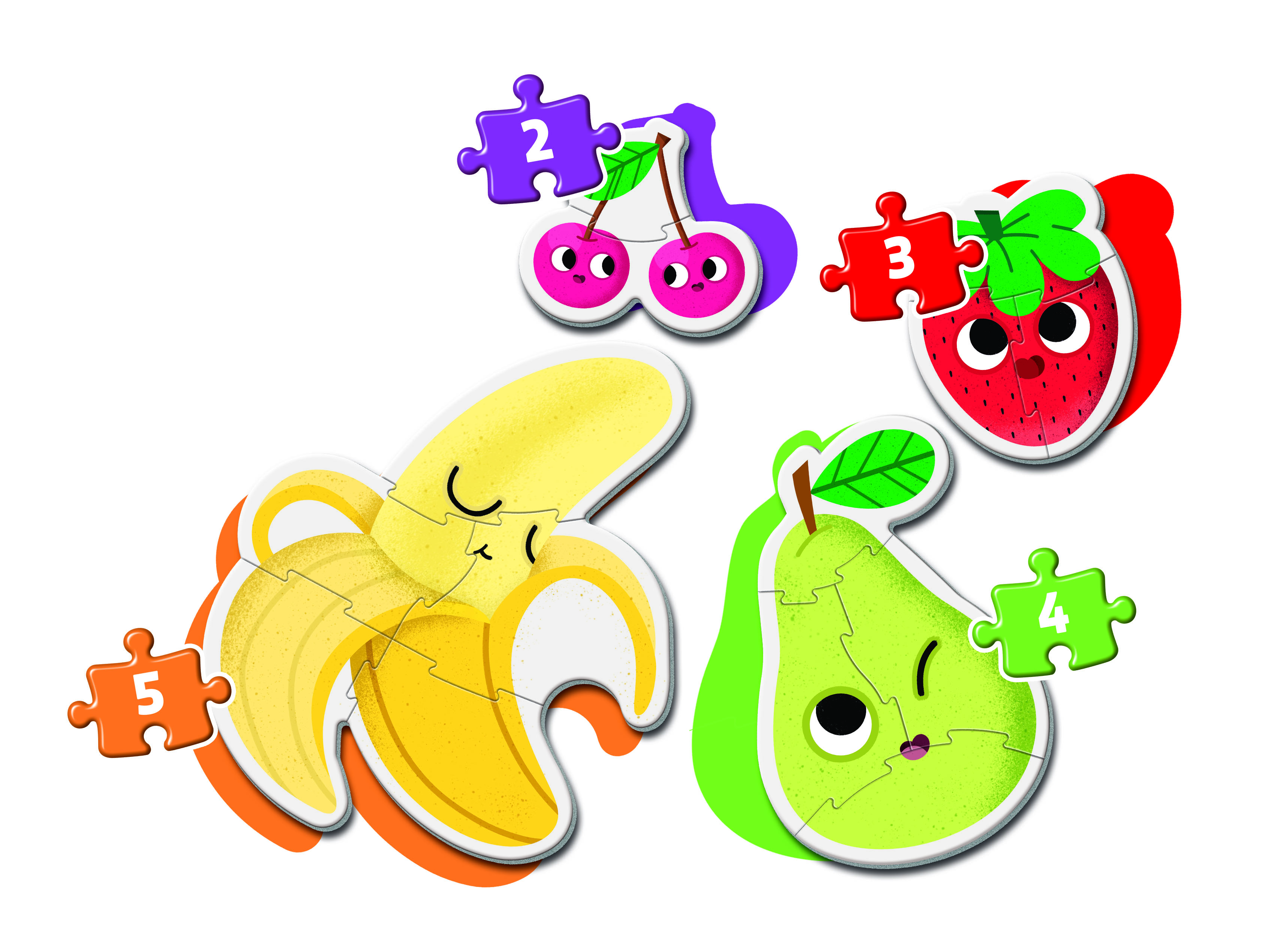 2, 3, 4 és 5 darabos (összesen 14 darabos), négy különböző alakú, gyümölcsök témájú puzzle, melyek fokozatosan nehezedő szintjeivel egyre nagyobb kihívást jelentenek a gyerekeknek. A legkisebb korosztály számára készült. A puzzle darabkák nagyobbak és vastagabbak a megszokottnál, így a kicsi kezek is könnyen boldogulnak az összeillesztésükkel. Rakd ki és ismerkedj a cseresznyével, eperrel, körtével és a banánnal! A lebilincselő képek élénk és ragyogó színekkel segítenek fejleszteni a gyermekek megfigyelőképességét, logikáját és kézügyességét, miközben ismerkednek az gyümölcsökkel. Kiváló minőségű anyagból és egy exkluzív nyomtatási technika használatával készültek ezek a szép, élénk és ragyogó képi világú kirakók. 24 hónapos korú gyermekek használatára CE minősítéssel ellátva!