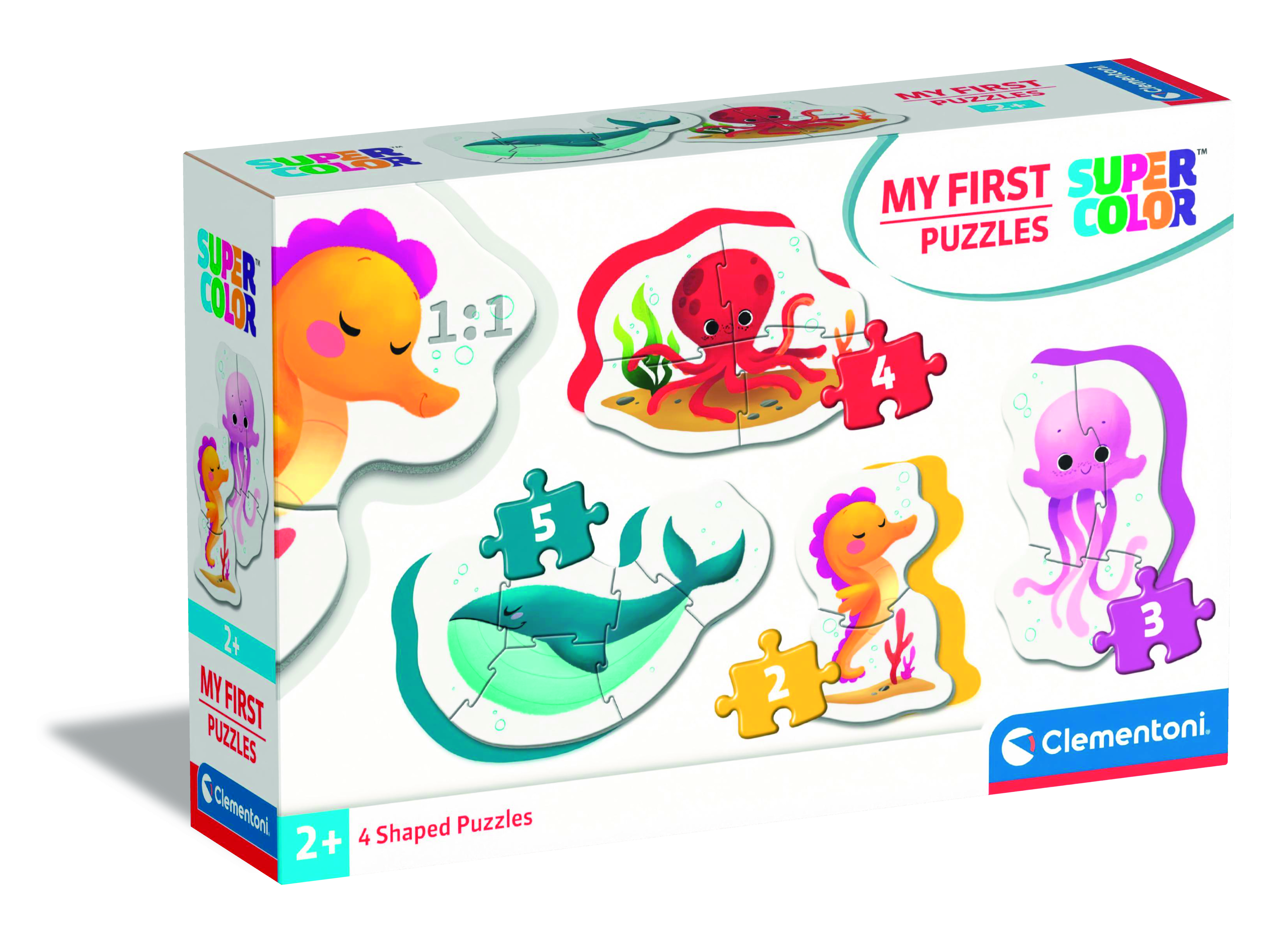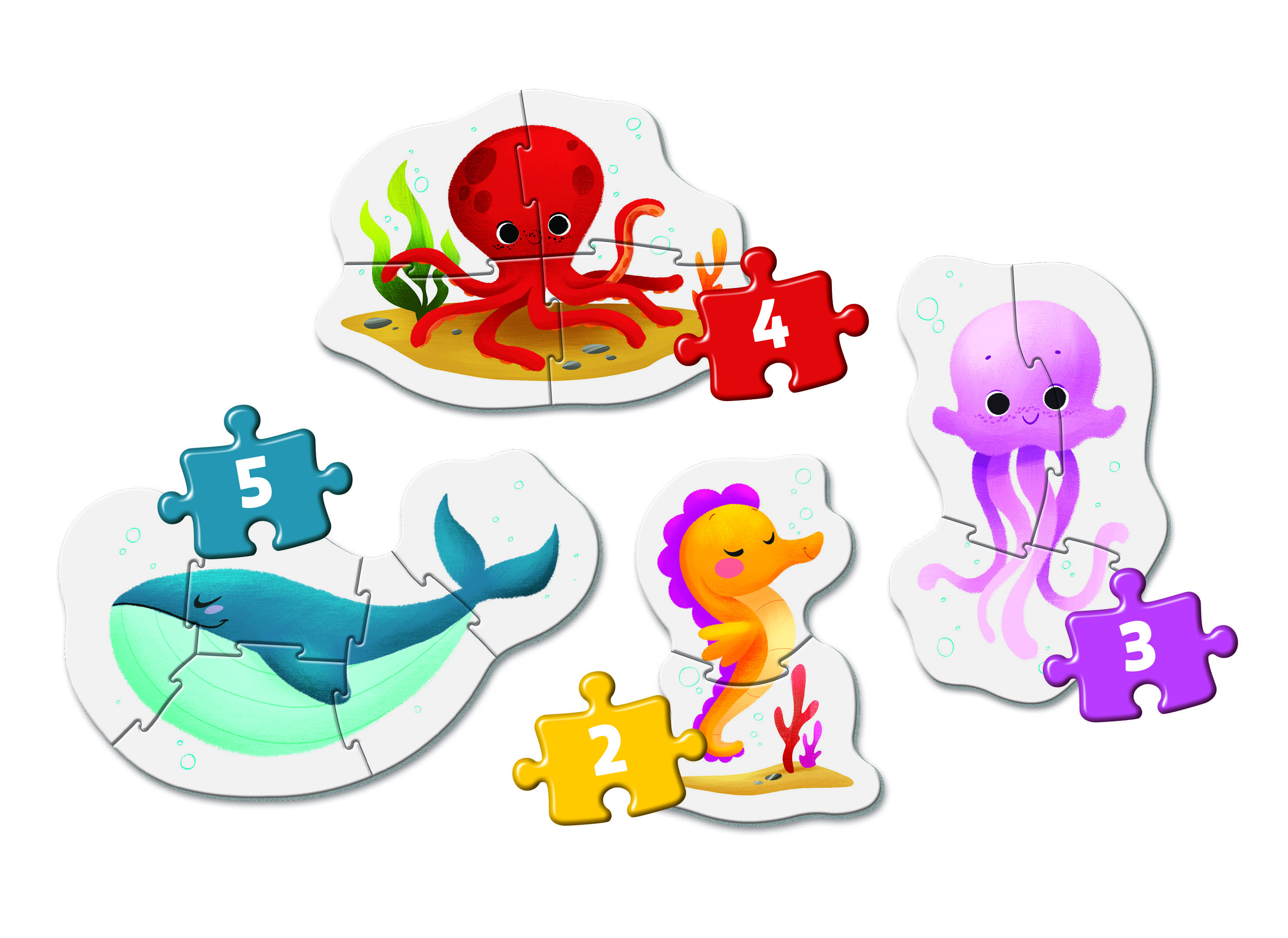 2, 3, 4 és 5 darabos (összesen 14 darabos), négy különböző alakú, tengeri állatok témájú puzzle, melyek fokozatosan nehezedő szintjeivel egyre nagyobb kihívást jelentenek a gyerekeknek. A legkisebb korosztály számára készült. A puzzle darabkák nagyobbak és vastagabbak a megszokottnál, így a kicsi kezek is könnyen boldogulnak az összeillesztésükkel. Rakd ki és ismerkedj a csikóhallal, medúzávval, polippal és a bálnával! A lebilincselő képek élénk és ragyogó színekkel segítenek fejleszteni a gyermekek megfigyelőképességét, logikáját és kézügyességét, miközben ismerkednek a vízben élő állatokkal. Kiváló minőségű anyagból és egy exkluzív nyomtatási technika használatával készültek ezek a szép, élénk és ragyogó képi világú kirakók. 24 hónapos korú gyermekek használatára CE minősítéssel ellátva!