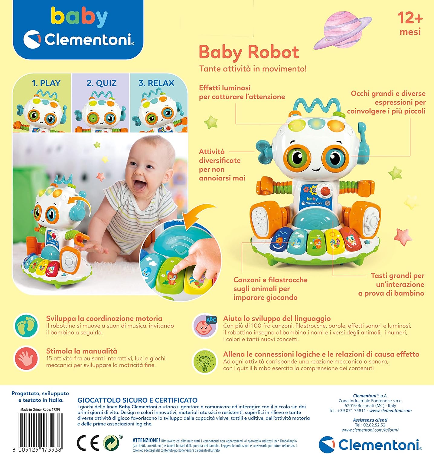 Az oktatási és kvíz módban a Clementoni Baby Robot mozgásba lendül, dallamokat és vidám dalokat játszik, hogy felkeltse a gyerekeket figyelmét. Többek között 3 funkcióval rendelkezik: Az első mód vidám és kalandos játékot kínál, tele nevetéssel és szórakozással. A találós kérdés módozatai lehetőséget biztosít arra, hogy a gyermekek felfedezzék a világot, és fejlesszék a logikai gondolkodásukat és memóriájukat. Alvó üzemmódban a robot mozgása leáll, és nyugtató dalokkal, mondókákkal szórakoztatja a kicsiket. Mindezeket vidám fényeffektusok kísérik, hogy még élvezetesebbé tegye a játékot. A robot karjai, gombjai és mechanikus tevékenységei számos különböző interakciót és megoldást kínálnak, amelyek segítik a gyermekek kézügyességének és az ok-okozati összefüggések megértésének fejlődését. A robot elemmel működik (3 db AA) Mérete: 30×20,3×32,2 cm 1 éves kortól ajánljuk!