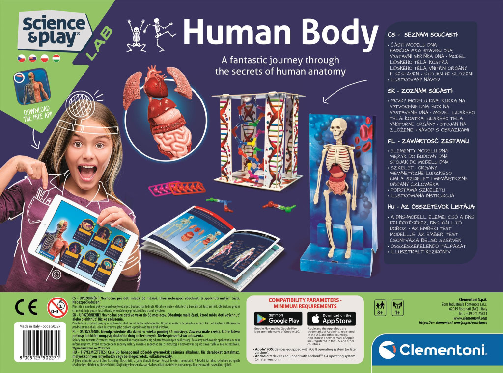 A Clementoni Az emberi test tudományos készlet látványos és oktató jellegű játék, amely segíti a gyerekeket az emberi test működésének megismerésében.