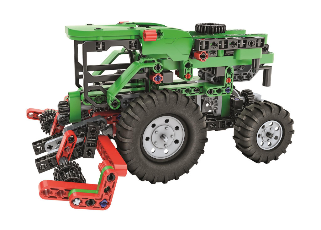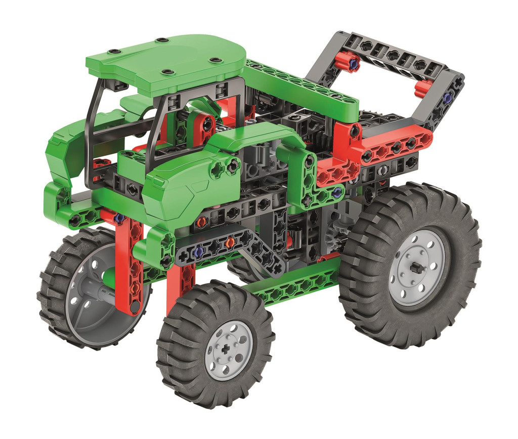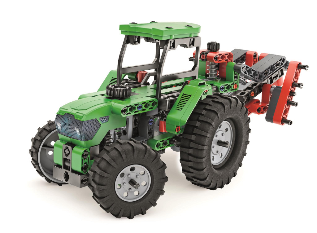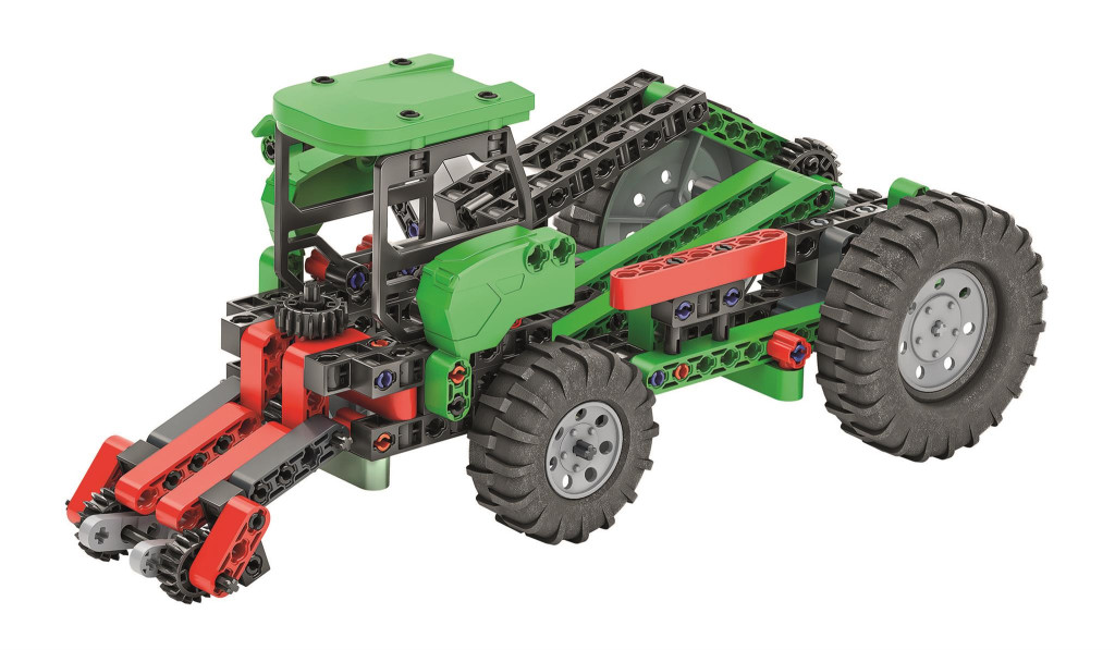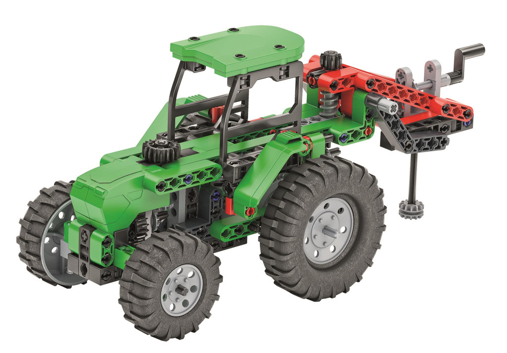 A készletből egy valósághű, mozgó traktor építhető meg, amely működő fogaskerekekkel és kormányozható kerekekkel rendelkezik.