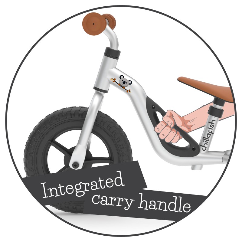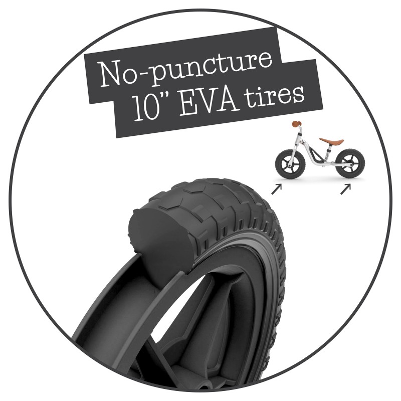 Könnyű, 2,5 kg-os fémváz szerkezettel ellátott futóbicikli 10-es méretű kerekekkel.