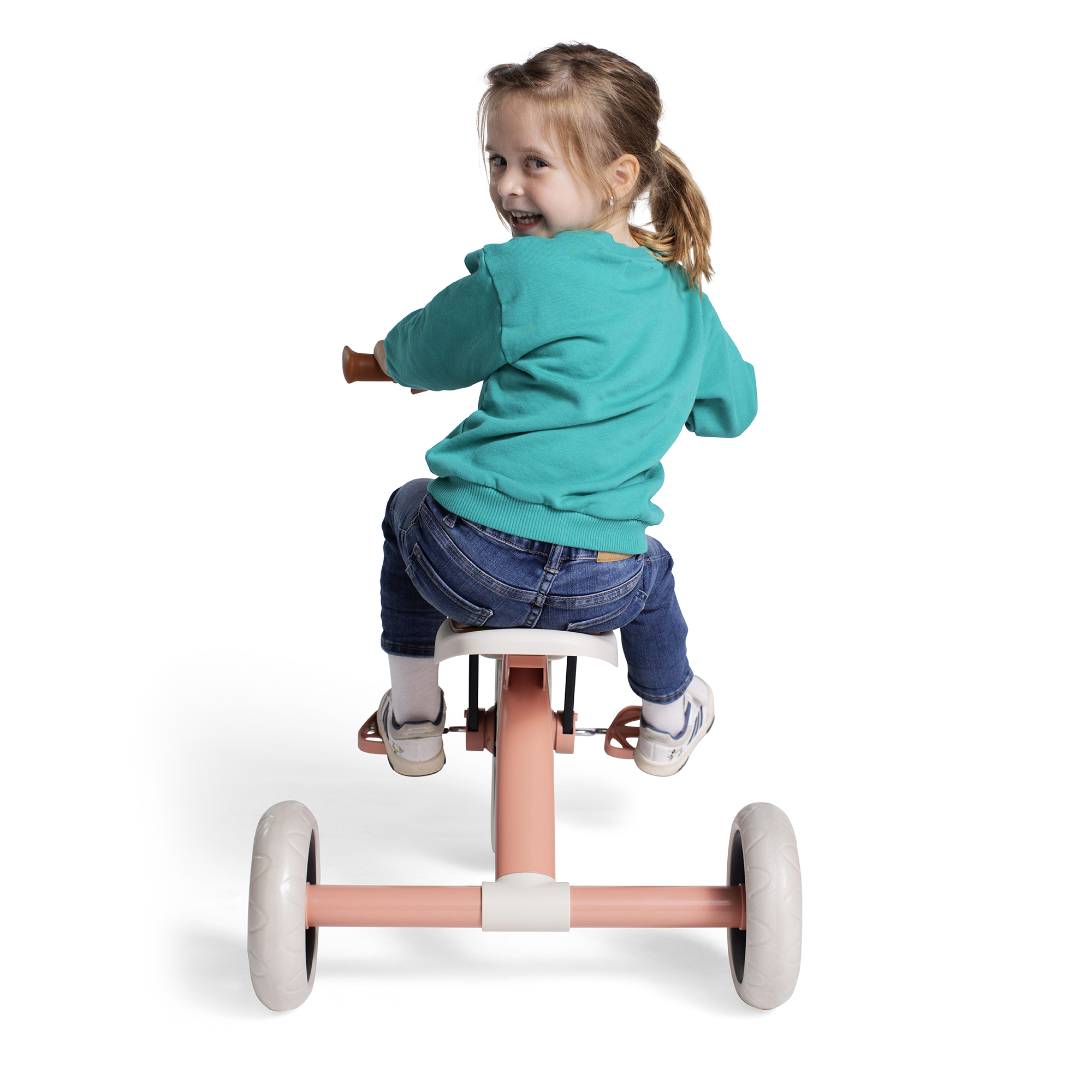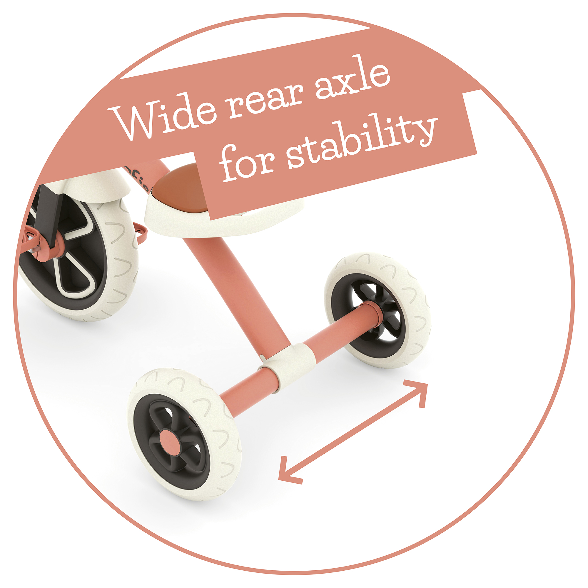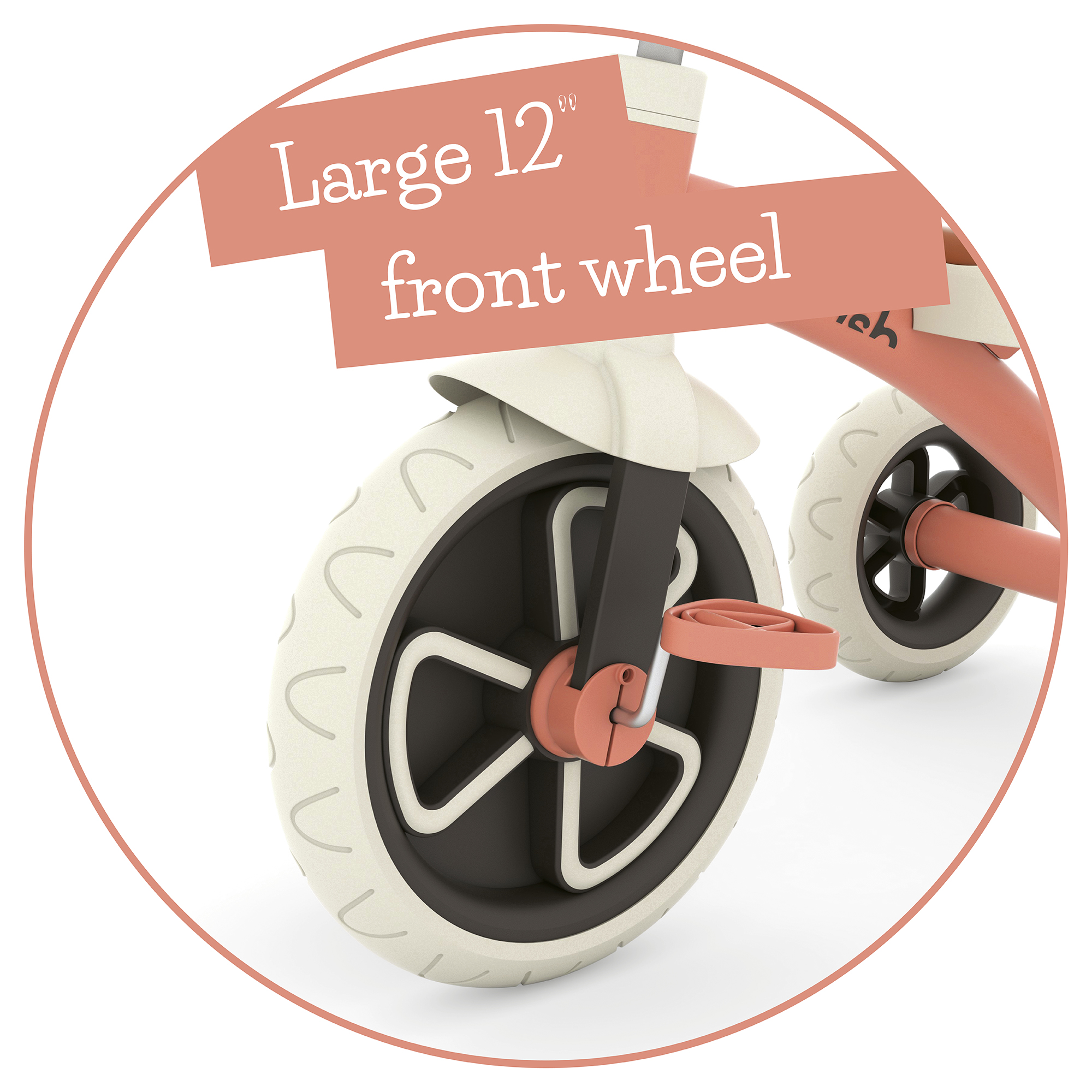 Ez a stabil tricikli nagy, 12 colos első kereke segíti a gyerekeket a lendület megszerzésében, míg a széles hátsó tengely extra stabilitást biztosít. A pedálos meghajtás támogatja a nagymozgások fejlődését, a kényelmes habszivacs ülés pedig beépített hordozófogantyúval rendelkezik. A kerekek halkak, nem hagynak nyomot, és defektmentesek – így beltéren és kültéren is biztonságosan használhatók. Könnyű kialakítása miatt egyszerűen irányítható a lakásban és azon kívül is.