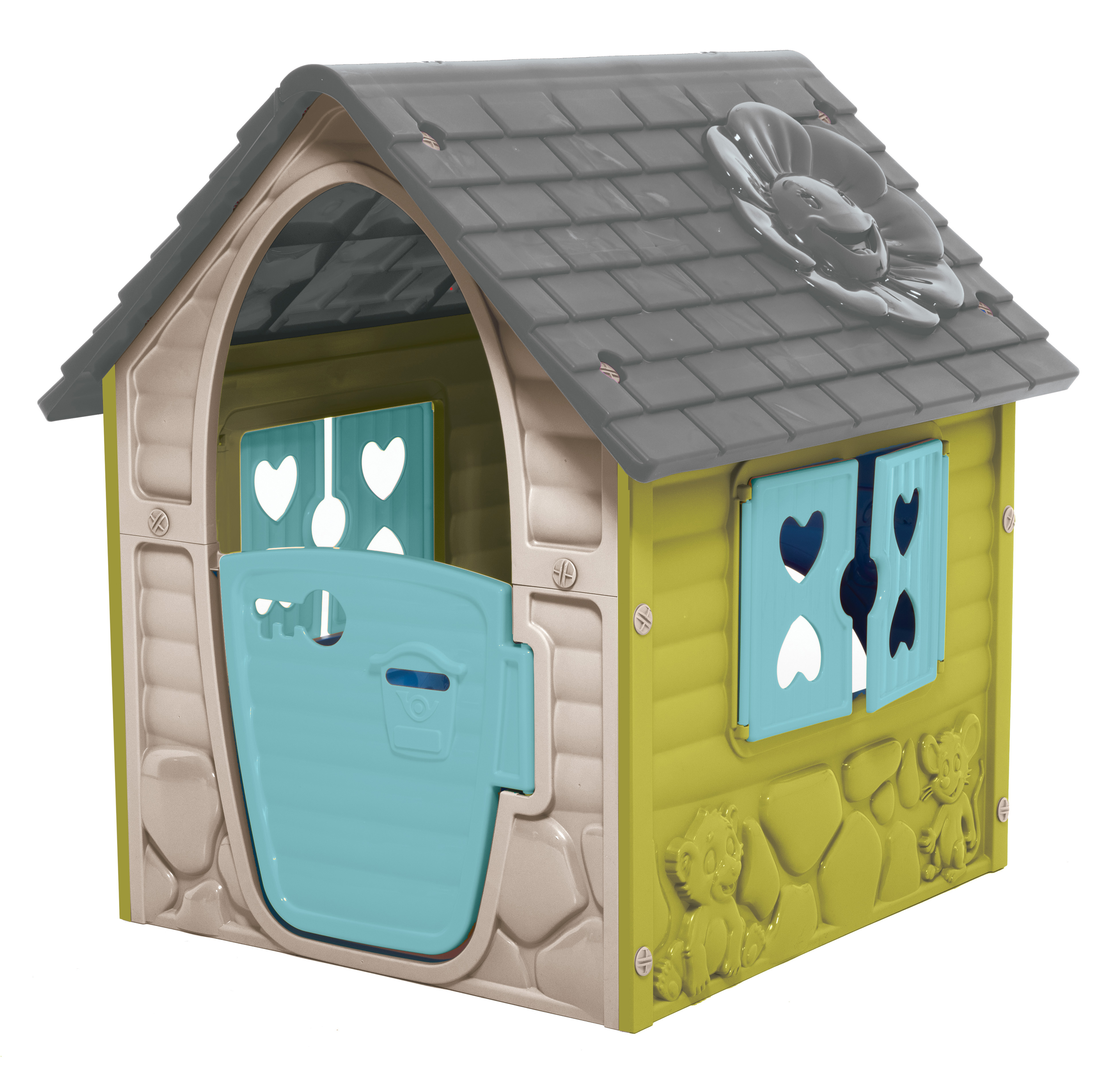 Vidám dizájn jellemzi: a ház tetejét egy mosolygós virág, míg az oldalát aranyos állatok díszítik.