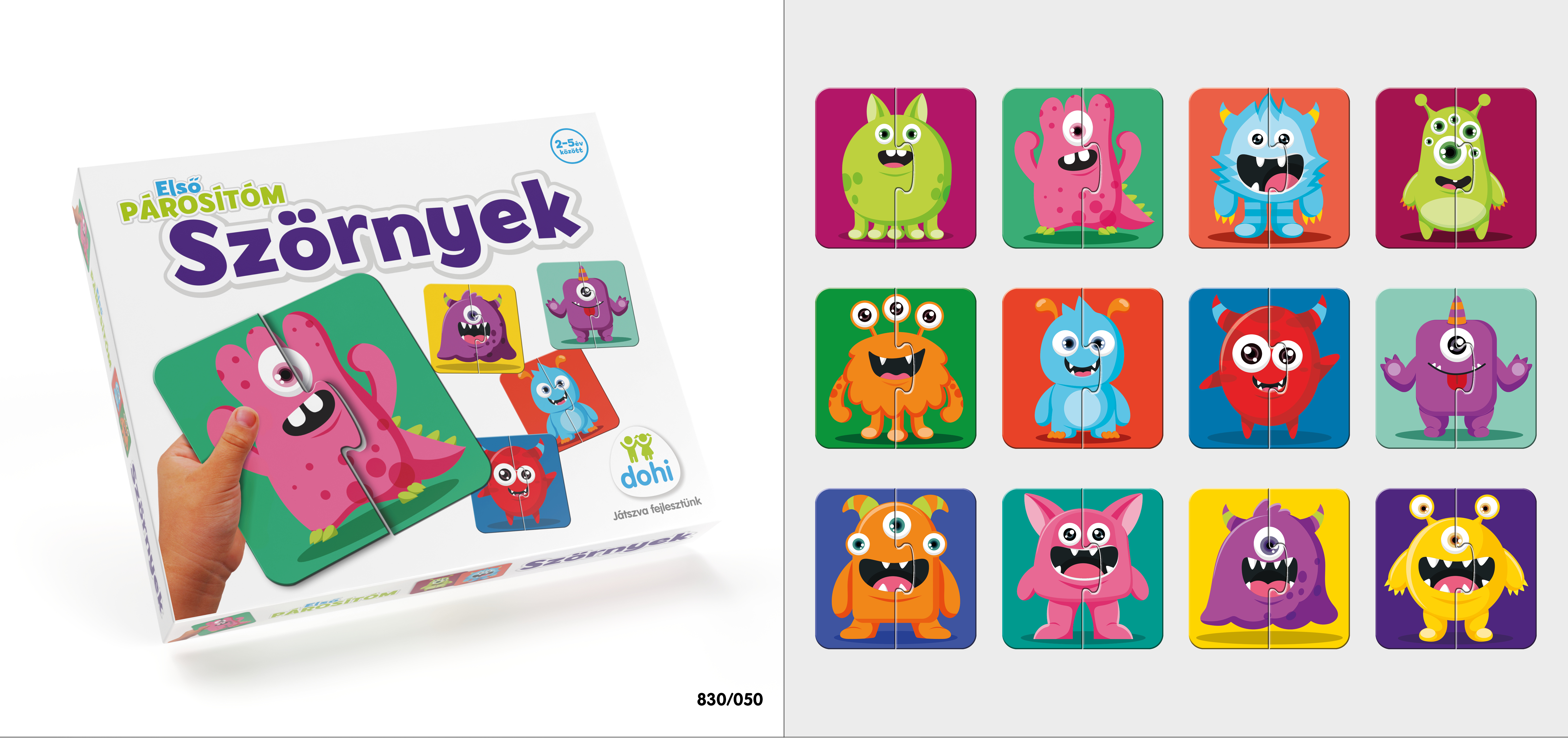 A dobozban 24 db fél kártyát találsz, amin különböző szörnyecskék szerepelnek. Jól jegyezd meg, hogy melyik kártyának melyik a másik fele.
