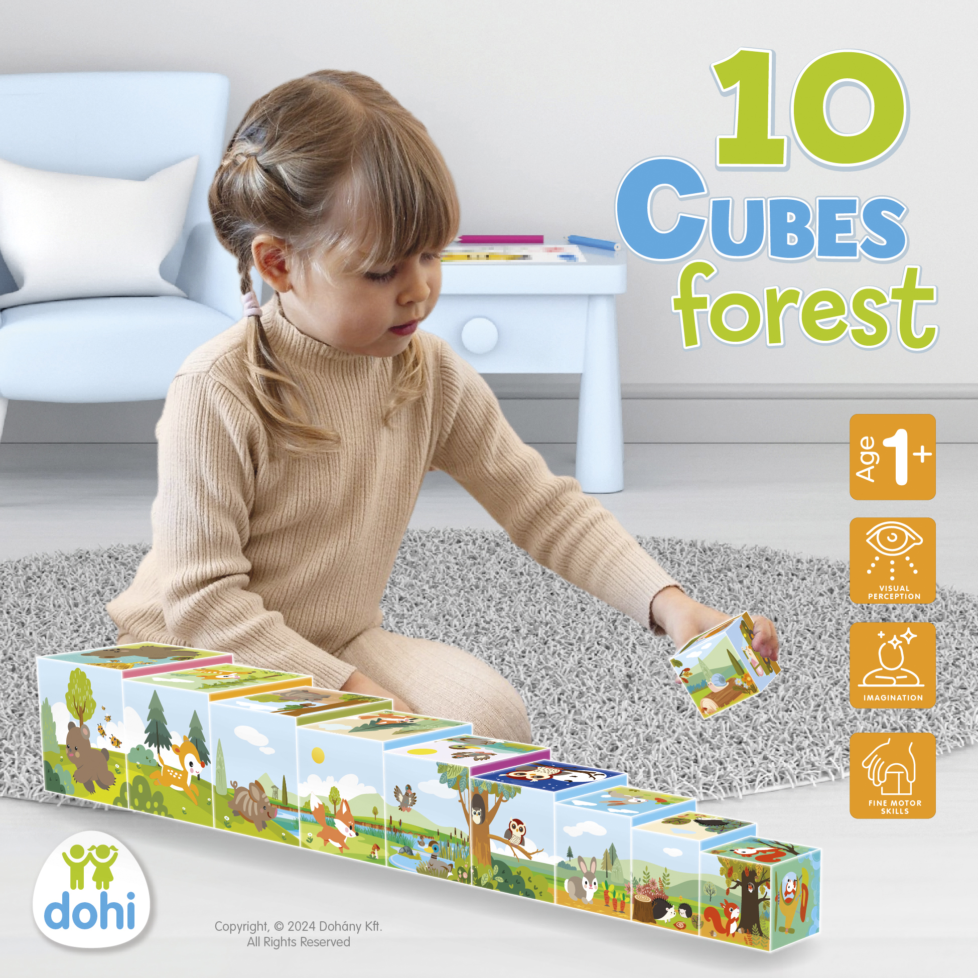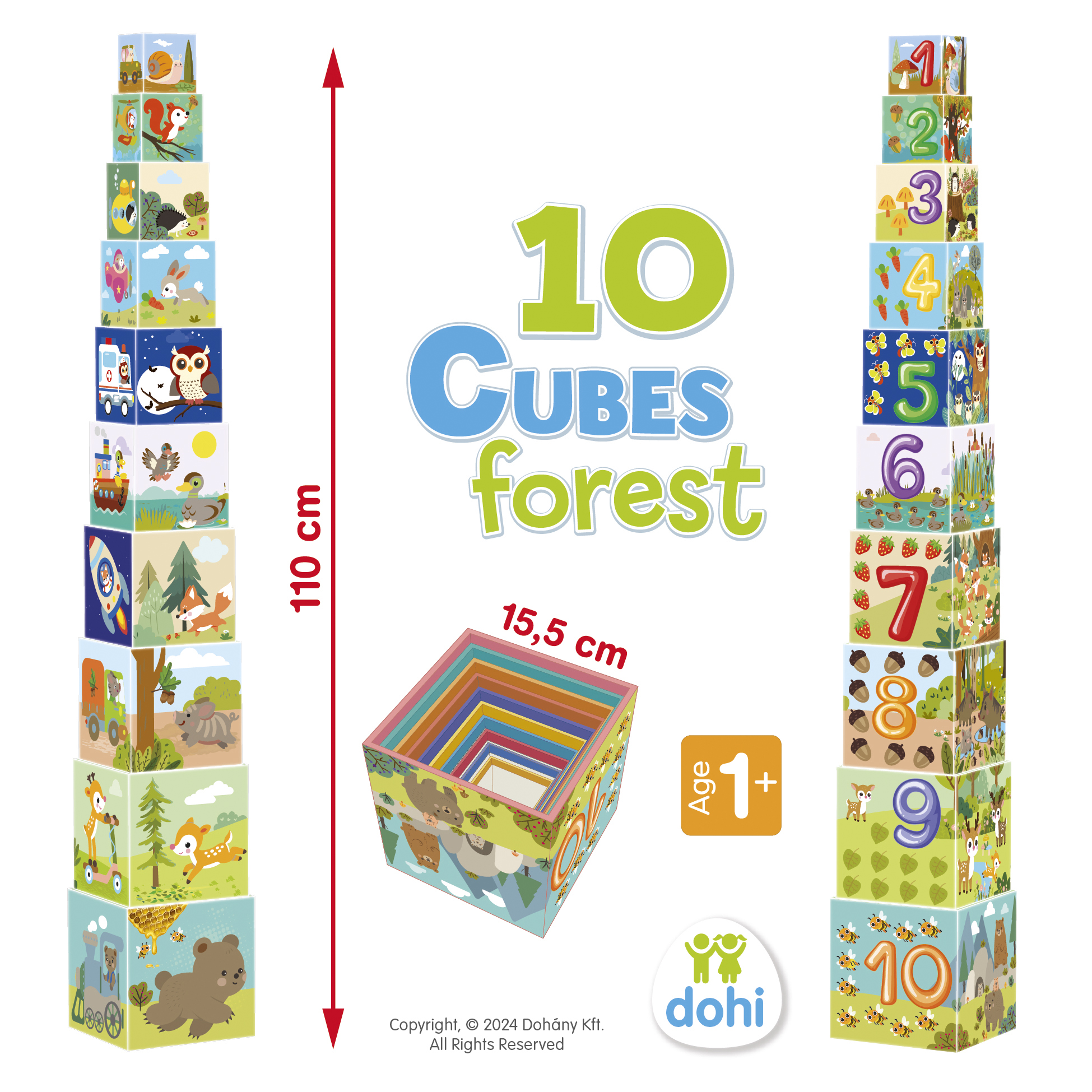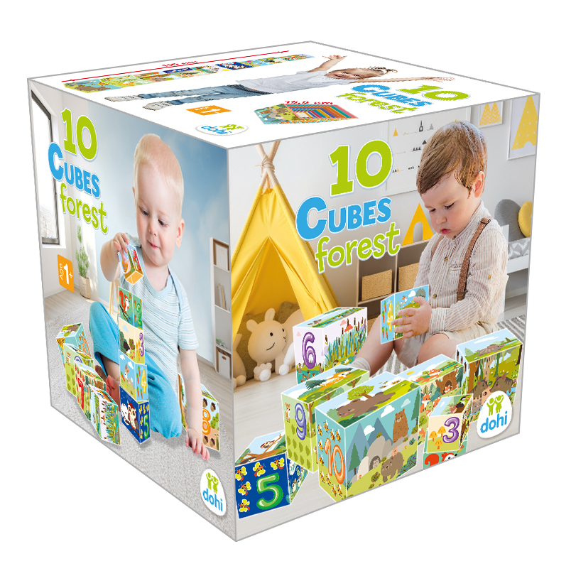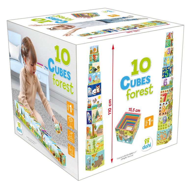 A legnagyobb kocka oldalának a mérete 15,5 cm. Helytakarékos, mert a kockák egymásba rakhatók. 10 kockából álló, erdőhöz kapcsolódó motívumokkal díszített kockakészlet. Fejleszti a finommotorikát, a logikus gondolkodást, szem-kéz koordinációt.