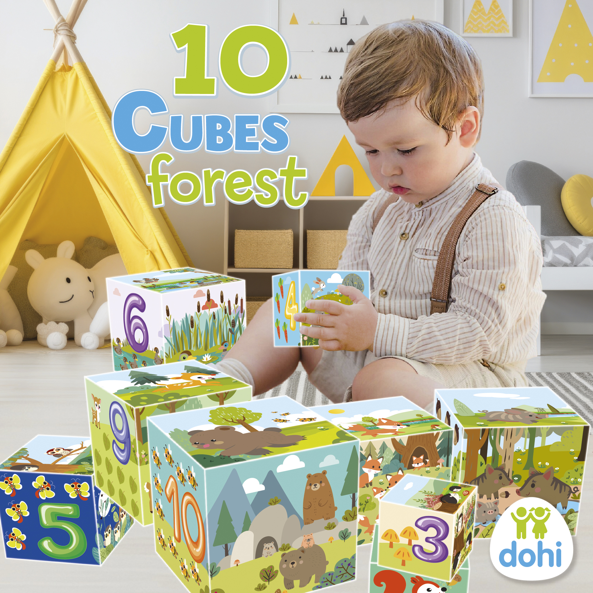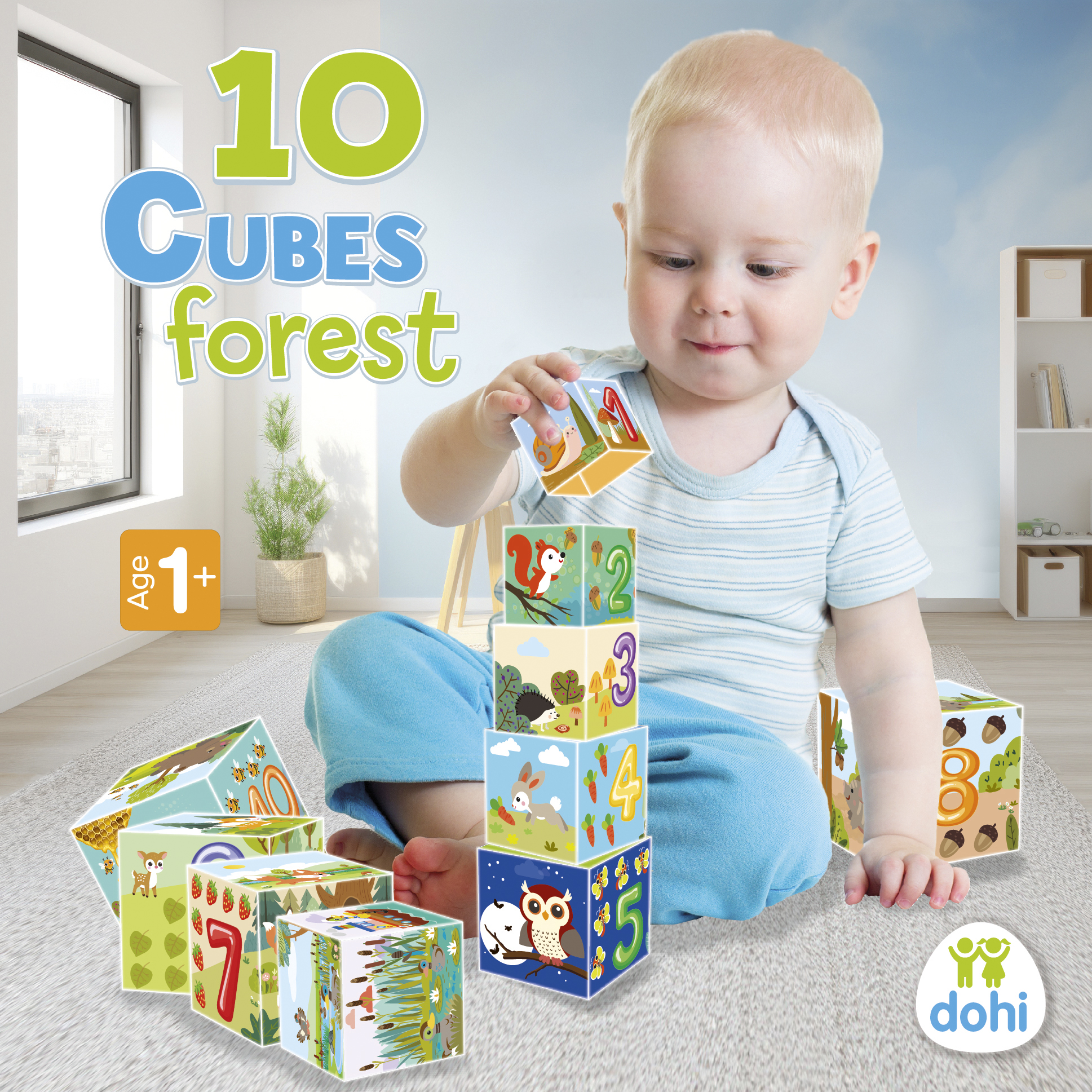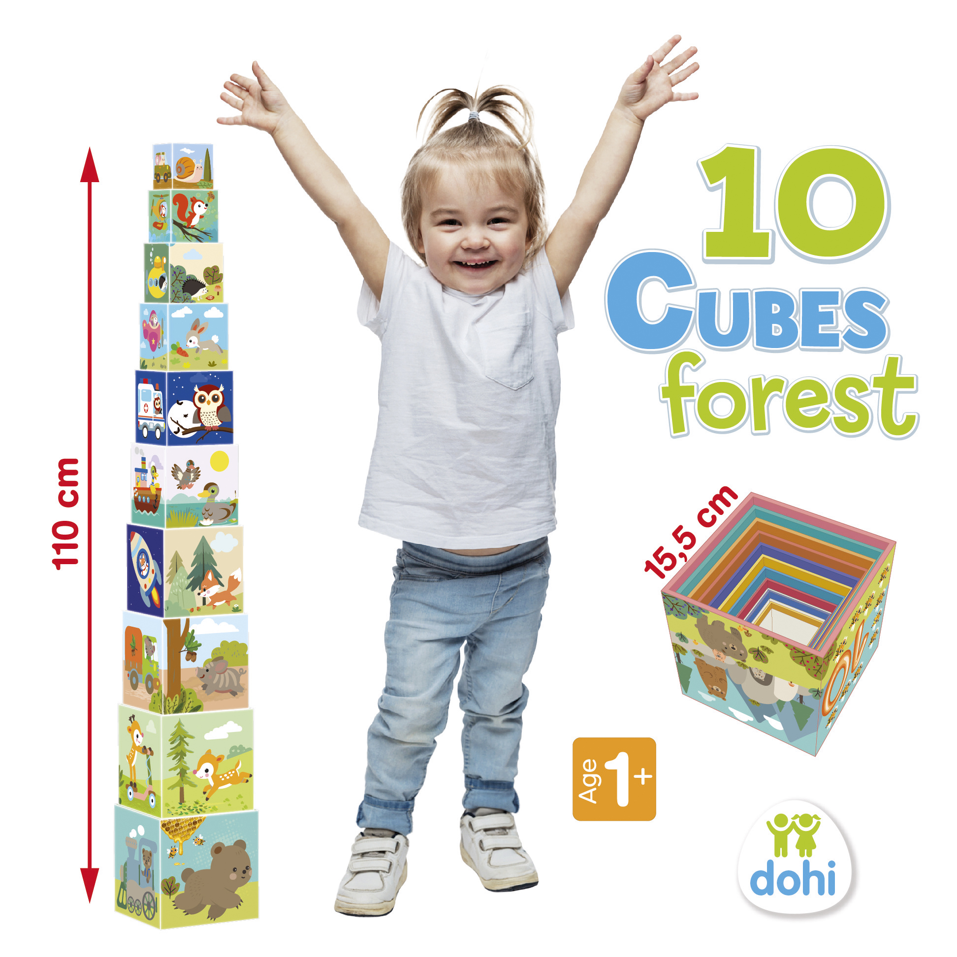 A legnagyobb kocka oldalának a mérete 15,5 cm. Helytakarékos, mert a kockák egymásba rakhatók. 10 kockából álló, erdőhöz kapcsolódó motívumokkal díszített kockakészlet. Fejleszti a finommotorikát, a logikus gondolkodást, szem-kéz koordinációt.