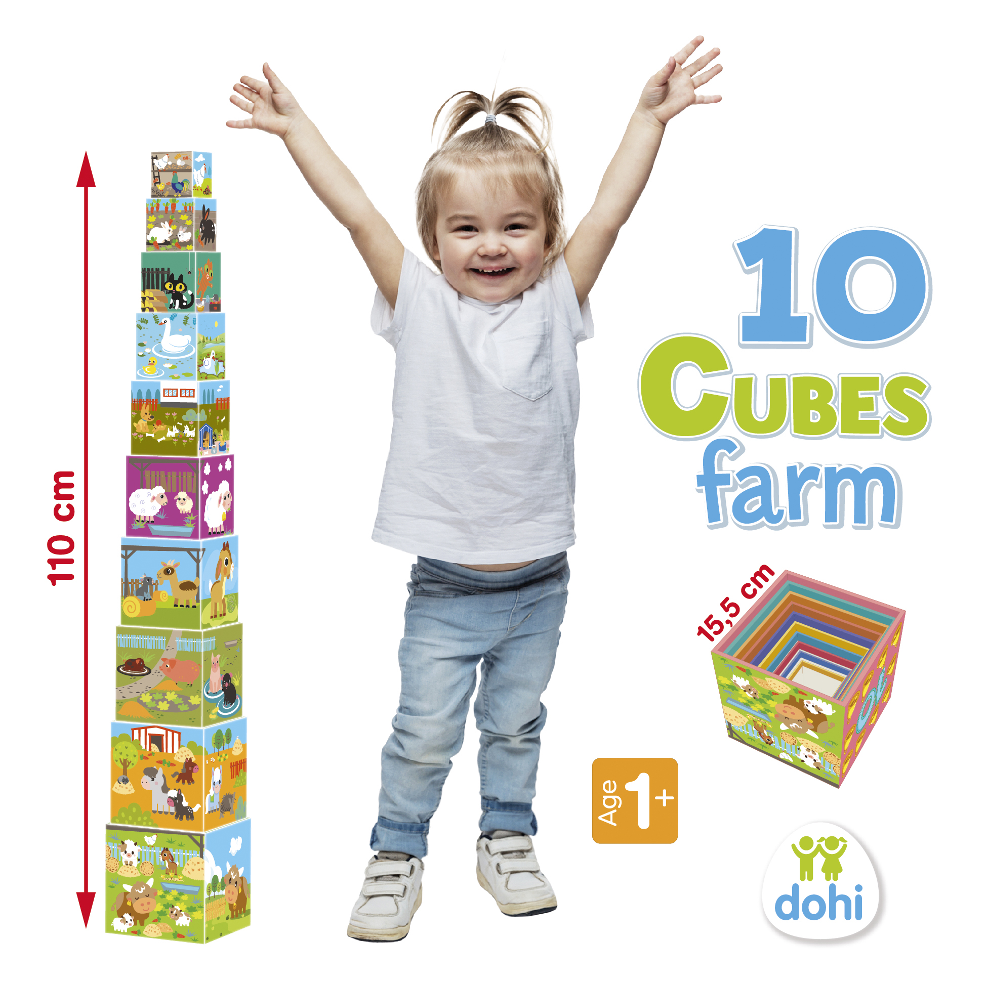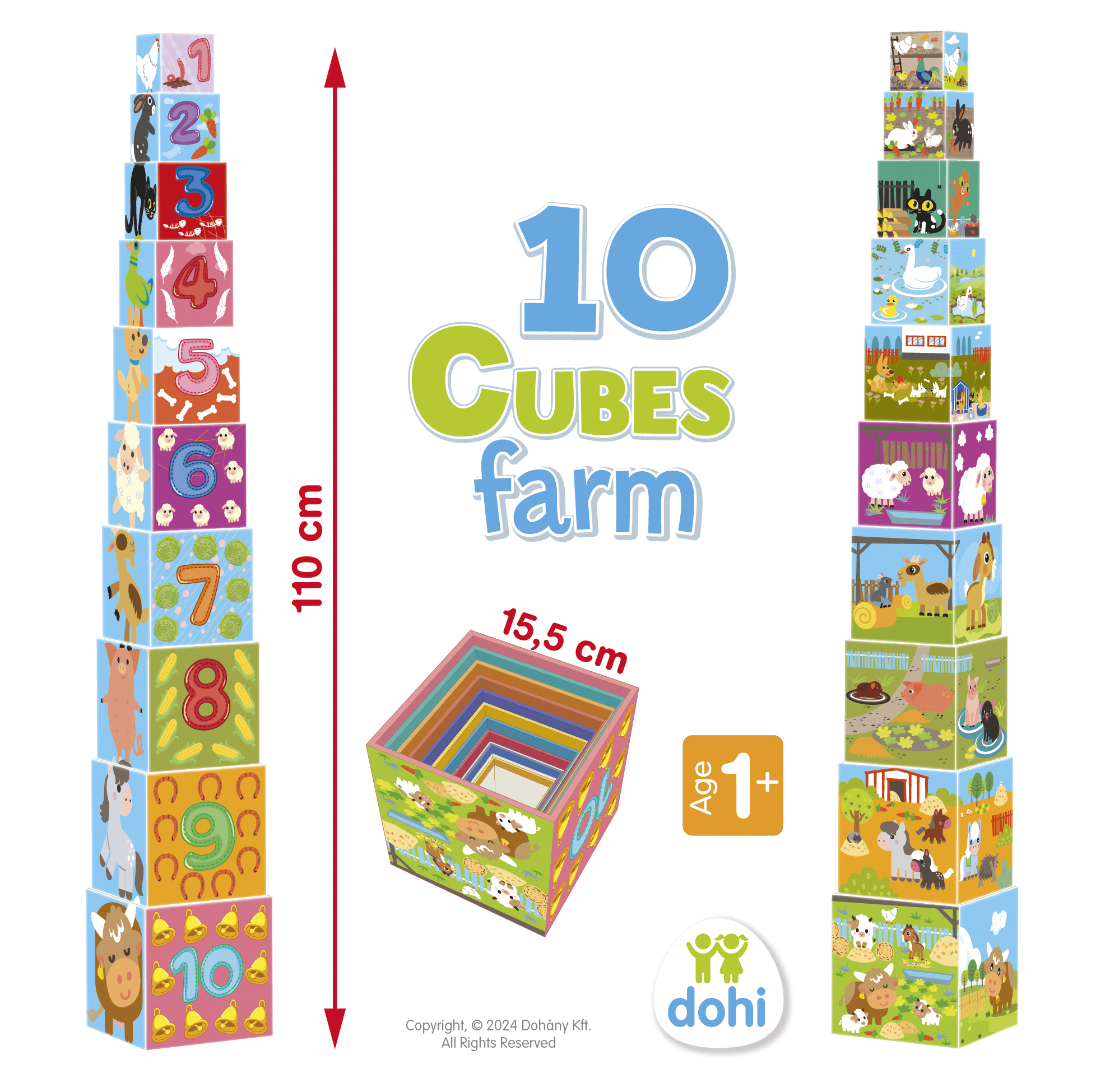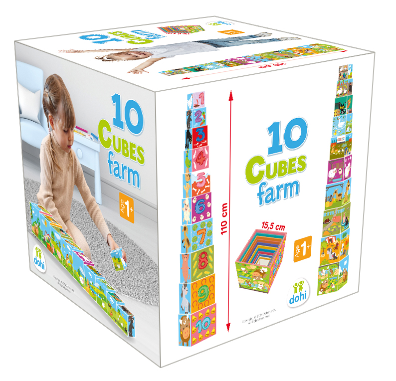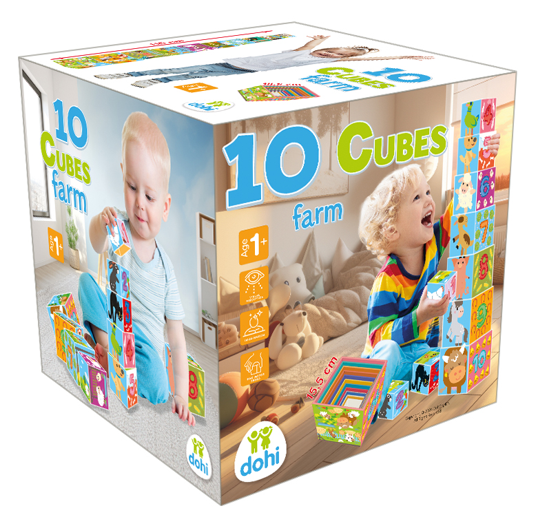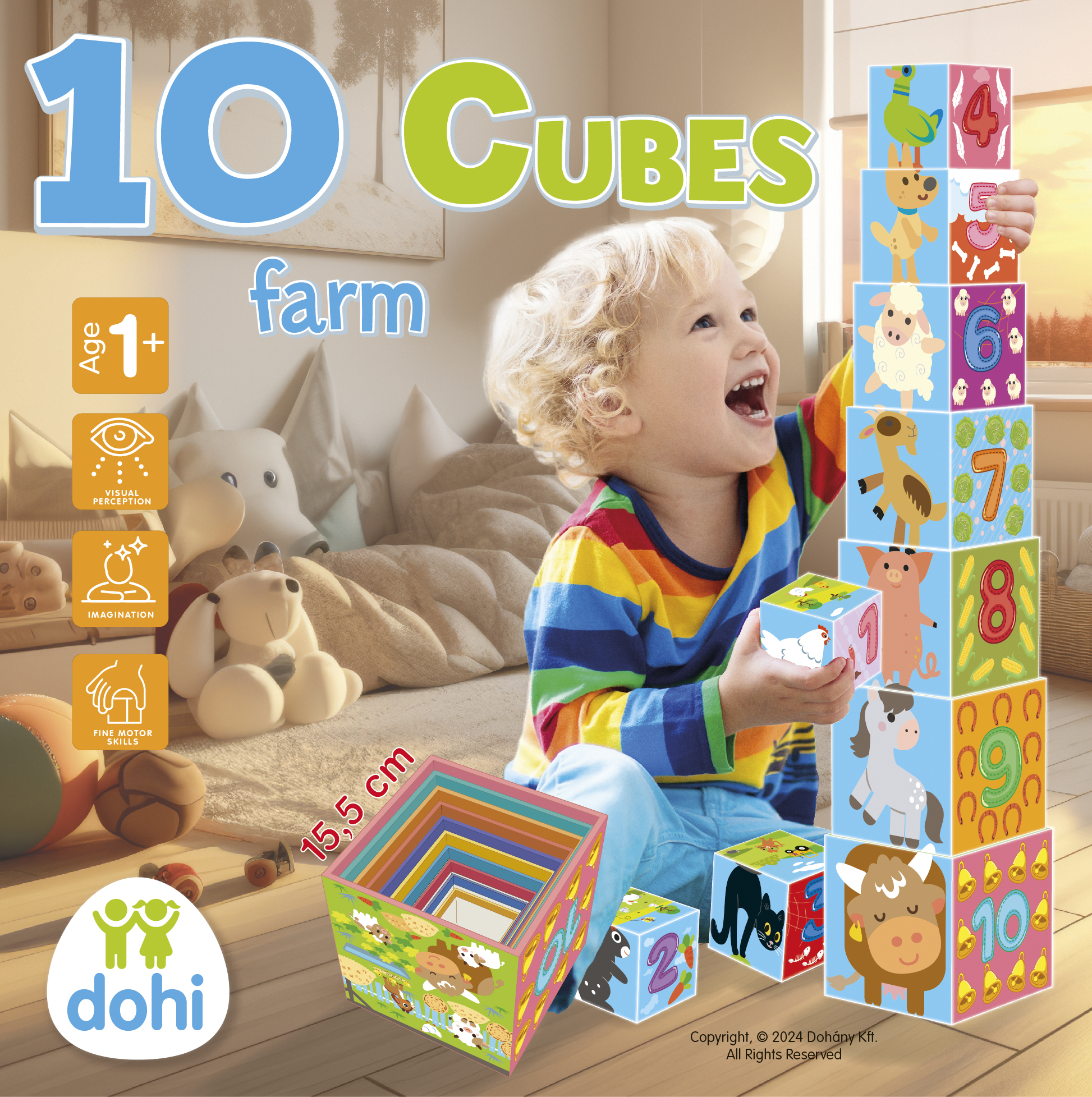 A legnagyobb kocka oldalának a mérete 15,5 cm. Helytakarékos, mert a kockák egymásba rakhatók. 10 kockából álló, farmhoz kapcsolódó motívumokkal díszített kockakészlet. Fejleszti a finommotorikát, a logikus gondolkodást, szem-kéz koordinációt.