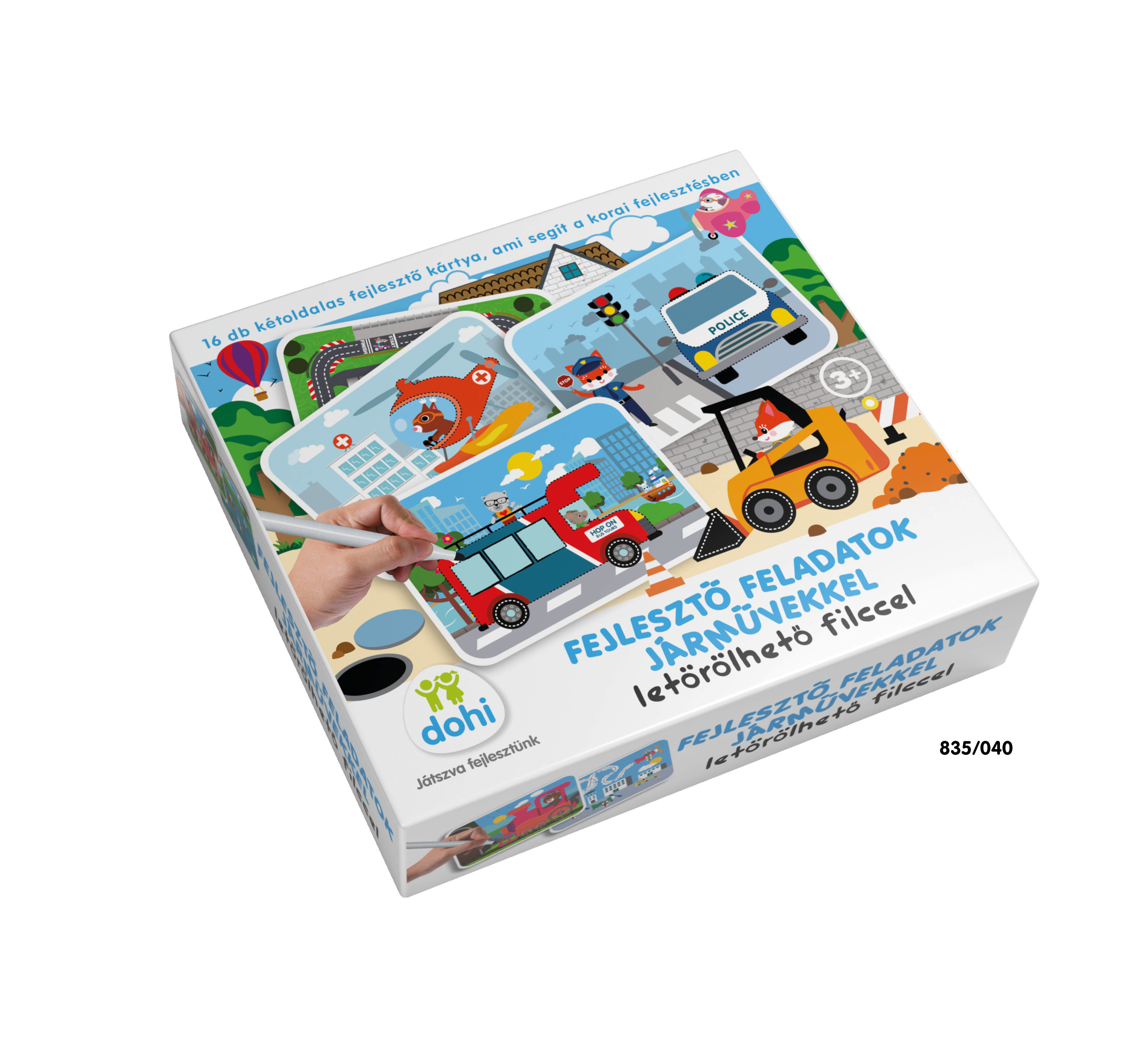 A doboz mérete: 18,5x17,5x4 cm a kártyák mérete: 16,5x11,5 cm. 16 db kétoldalas, letörölhető fejlesztő kártya