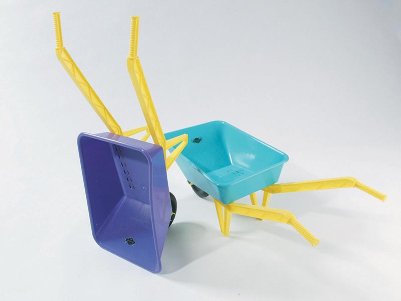 Az élénk színű, műanyag talicska egy igazán vidám kerti játék.