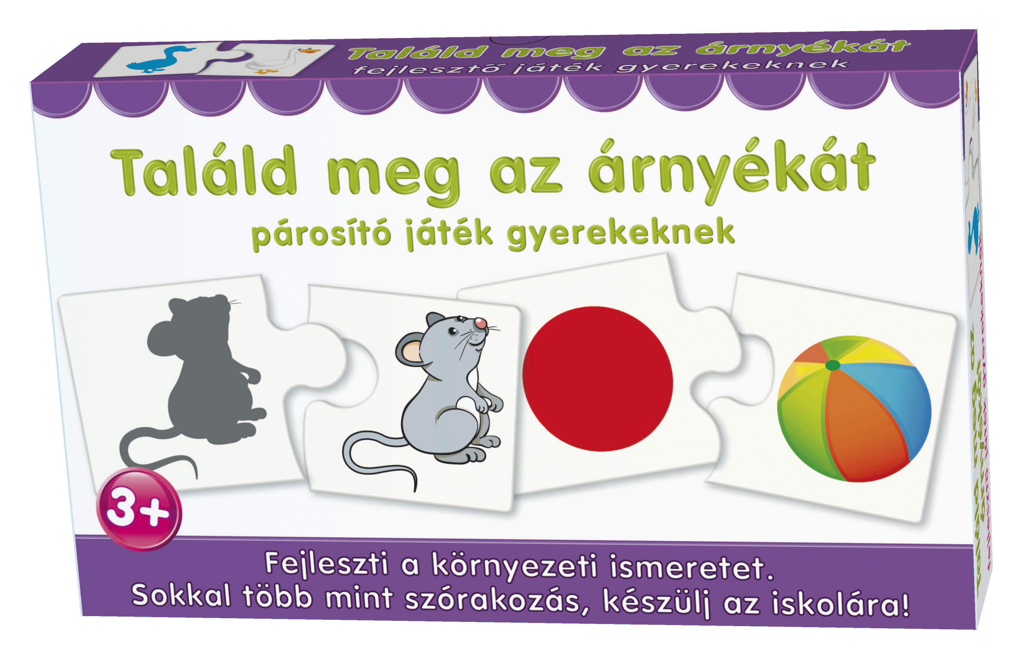 Találd meg az árnyékát – párosító játék Tartalma: 12 pár összeillő puzzle-darab (összesen 24 lap) Mérete (doboz): kb. 28x18x4 cm Anyaga: kemény karton puzzle lapok Ajánlott életkor: 3 éves kortól
