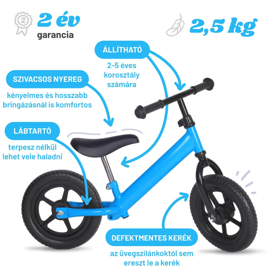 Bölcsődés futóbicikli. Ajánlott korosztály: 2-3 éveseknek. Jellemzői: defektmentes tömör, 12"-es kerék (28 cm átmérőjű) Állítható magasságú kormány és ülés. Szivacsos nyereg. Kényelmes hajtást biztosít a lábaknak a szűk lábtartó kialakításának köszönhetően. Nagyon könnyű, mindössze 2,5 kg Szállítása: összeszerelt állapotban Ajánlott korosztály: 2-3 év Színe: égkék